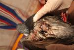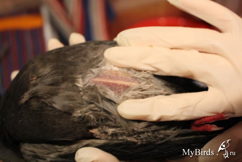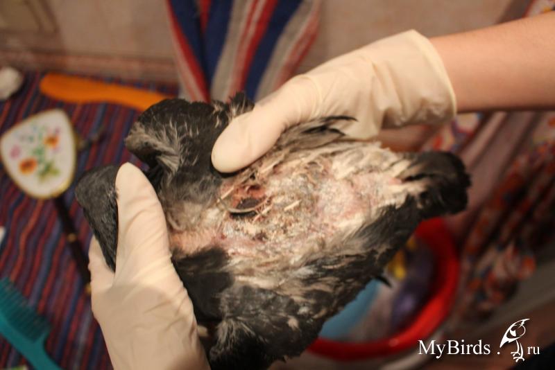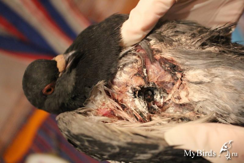 Aljona79 Опубликовано 24 декабря, 2015 #1 Опубликовано 24 декабря, 2015 Здравствуйте, дорогие форумчане!Вчера нашли голубя, летать не может. Был грязный. Спина и шея лысая, кожа повсеместно сухая, красная, воспаленная, с язвами. Раны местами черные, похоже на некроз тканей. Под крыльями раны глубокие, в глубине немного мокрые. От голубя шел специфический затхлый запах. На животе под перьями кожа покрылась небольшими желтыми корками. Вокруг глаз красные высыпания. Открыли клюв, горло чистое. Голубя отмыли. Раны почистили Диоксидином 1 %, побрызгали спреем Bionect SilverSpray (он регулирует водопоглощение раны, создавая среду для содействия процессу естественного исцеления и эффективно защищает от микробного загрязнения, поступающего в рану.) Начали давать Ципрофлоксацин 250 - четверть таблетки развели в 2 мл воды (в шприце на 2 мл), и даем 2 раза в день по 0,2 мл. Голубь ест и пьет хорошо, живет в коробочке. Кормим сухой гречкой, чечевицей. Завтра хотим купить пшено и семечки, и мазь левомеколь. Ещё мне сказали, что в корм надо добавлять специальные камушки, которые дробят пищу и помогают лучше ее переваривать, иначе птице можно испортить пищеварительную систему. Так ли это? Если так, то что ему нужно добавлять в корм?И не понятно, что это за болезнь такая, может его кот подрал, и развились такие раны, или это грибок какой. Что делать с голубем? Помогите узнать, что с ним? Как его правильно лечить и как правильно кормить? К ветеринару есть возможность попасть только через 3 дня, сейчас праздники, они не работают.Помогите, пожалуйста, вылечить голубя.Высылаю несколько фотографий его ран и помета (если белое на ранах, то это нанесен спрей Bionect, сами раны красные, местами черные). Помет темно зеленый с белым.