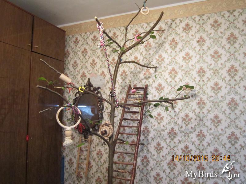 Марго+Алекс Опубликовано 18 января, 2016 #3 Опубликовано 18 января, 2016 (изменено) igorkrecul, мы спилили дерево в лесу,искали специально с поперечными ветками,но можно и более вытянутыми,между ними просто вставить поперечные жёрдочки,чтобы птице было удобно сидеть. Крепили в старую основу (треногу от кух.стола),но можно взять большой цветочный горшок ,поставить деревце и залить цементом для крепости,а сверху чем -нибудь задекорировать,например,мелкими камушками для аквариума,подумать куда поставить горшок,может на тумбу или табурет,попугаи любят сидеть высоко. На стенд повесить игрушки ,шишки,качель... Естественно, дерево брать вдали от трассы,хорошо,с губкой и мылом (простым)его промыть и ошпарить,там же нарезать запасных жёрдочек,на всякий случай,диаметр для кореллы нужен 2,5 - 3см. Изменено 18 января, 2016 пользователем Марго+Алекс
