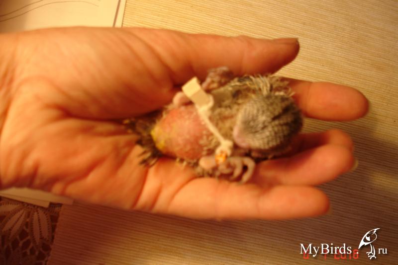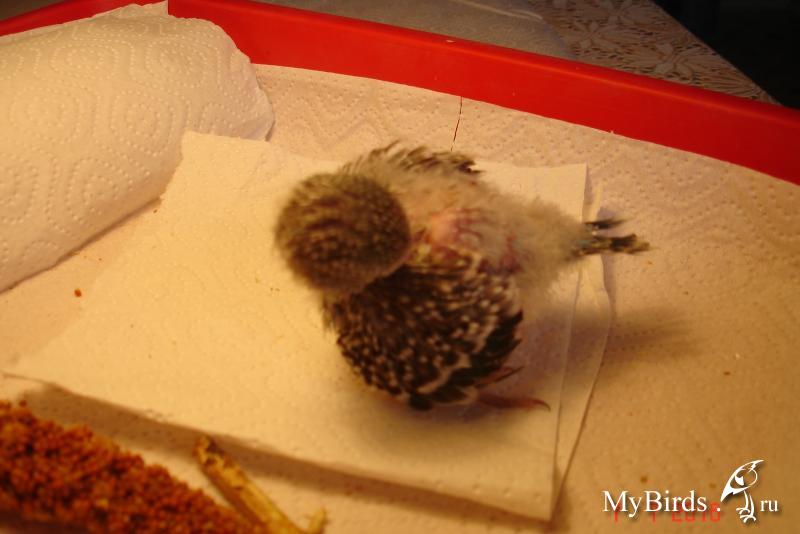 DAIANKA Опубликовано 8 июля, 2016 #1 Опубликовано 8 июля, 2016 Волнистый попугай, птенец ВВП, возраст 24 дня (вылупился 14.06.2016).В помещении температура воздуха 25 град. С, влажность 45-50%, день - 14 часов. Лампы в вольерах специальные с УФ - Arcadia.02.07, в субботу вечером в гнезде обнаружила птенца (18 дней) лежащим с вывернутыми назад лапами, зоб был пустой, головка неподвижно лежала, не пищал. У родителей - 2-ая кладка, 7 птенцов, этот - первый. Птенцов распределила по двум гнездам. Этого птенца воспитывали приемные родители, всего было 4 птенца у них в гнезде. Гнезда с пластиковыми вкладышами (Graf), внутри - гранулированные опилки толстым слоем.До этого дня птенца кормили нормально; ежедневно проверяла зобы.Родителей кормила сухим кормом - престиж, яйцо, пророщенное зерно, многозерновые каши, овощи, фрукты. Витамины и добавки: водорастворимый Calci-Lux с добавлением в поилку водорастворимого вит.D3, мультивитамины quico на кашу, минеральная подкормка Re-sha, РИО, мел, сепия - в свободном доступе в клетке. Вторая кладка последовала сразу за первой, родители молодые, у обоих это первые две кладки. Подготовка была проведена.Помет у птенца - нормальный.Когда птенца обнаружила, подумала, что родители его случайно придавили, прыгая в гнездо и вряд ли он доживет до утра. Осмотрела птенца, ран не увидела. Приготовила кашу из безмолочной Хайнц, добавила нутриберд 19 (1:1). В смесь добавила кашу из сваренного измельченного пшена для густоты . На шприц 10 мл добавила 2 капли витаминов Beaphar Trink+Fit. Этой кашей продолжаю кормить малыша по сегодняшний день. Первые три дня кормила каждые два часа круглые сутки. Съедал по 2 мл каши. Два последние дня делаю перерыв на ночь -6 часов, затем кормлю через 2-3 часа. Съедает по 3-4 мл каши. По две капли воды после каждого кормления тоже даю. Не знаю, нужно или нет, но каша - густая.Родители птенца не кормили и сейчас не кормят, хоть он и начал поднимать головку. На ночь я птенца подкладываю в гнездо. Днем он находился в коробке под лампой накаливания, чтобы не мерзнуть. 5 июля 2016 (на третьи сутки после обнаружения беспомощного птенца в гнезде), сделала ему браслеты (под коленками), он так смог сидеть. Может, нужно и над коленками сделать? В таком состоянии начал немножко передвигаться, помогая себе клювом. Левую ножку - хуже подтягивает. Головку уже может недолго держать. Ест активно, пищит. Постоянно пробую его в гнездо положить, но родители, по- прежнему, не хотят его кормить. Самка находится вместе с птенцами в гнезде, не кормит его, но и не трогает.Ежедневно заставляю его понемножку передвигаться.Напишите, пожалуйста, вертолет ли у птенца? Не навредила ли я ему этими браслетами, может, он просто слабый? Что нужно делать дальше? Очень надеюсь на ваши советы.Прилагаю фото и видео сегодняшнее, если удастся загрузить.