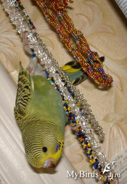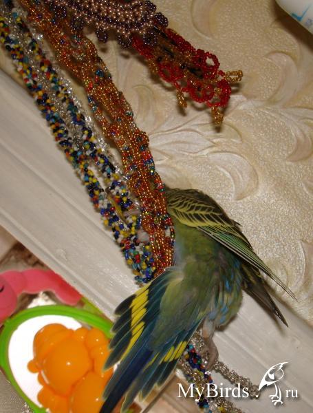 NatalyNK Опубликовано 31 марта, 2017 Автор #69 Опубликовано 31 марта, 2017 Птенец №2 (кольцо 14) Девочка. У нее египетская "прическа" и аккуратные, в 2 яруса, бусики.Египтянка. Клео Приспособилась к клеванию размоченного мягкого пшена с пальцев. Теперь САМА прилетает, как проголодается, и ищет зерна, которые сразу же "вырастают" на привычном месте )) Перышки с отливом, хвостик яркий. Окрас - темно-зеленый опалин с фио и нормальной волной. А это изумрудный братик - птенец 4 (кольцо 16) светло-зеленый оплин с фио и норм волнойА это сон. Просто полуденный сон мальчишек. А это желтый приземлился на штору. И пополз вверх. Одна лапа на одной тюли, другая - на другой. И так в просвете карабкался, затем в сторону окна в складочку залез. Ну, думаю, пойду выручать. Там же оконная ниша, тупик. А он вон каков: нашел просвет между крючочками и сам вылез И ни капли не испугался непонятных складчатых занавесок А это вешалка для галстуков колечки для попугаев.Когда старшая троица начала осваивать полеты, естественно, нужно было им показать, куда безопасно приземлиться. Для этого Ромочку посадила в колечко (он не пользуется этим девайсом), но его увидел желтый птенец. И обосновался там даже на ночной сон. А его уже спопугайничали сестренки. А это первый птенец (кольцо 13) случайно раскрутил удлинитель для наушников и.... удобно устроился в колечке А это мамочка, прилетевшая подкормить птенцов на прогулке А тут птенец обнаружил невероятно интересный объект: в шершавой корзиночке дерево с бусиками! Которые можно клювом отцеплять и завороженно смотреть, как желтый янтарь падает вниз!Теперь с корзинкой у нас частые фотосессии. Это первая Li-Pi, с момента регистрации на форуме.Тогда мы с мужем только стали жить вместе, и он превратил квартиру в лес (появилось множество цветов).И когда смотрели на это бушующее великолепие, поняли, что страшно не хватает птички.Выбирали месяц. Решили, что нам нужен "смелый, умный, любознательный зеленый самец". Вот именно такой и нашелся тут, у форумчанки из Москвы, Таня60. Спасибо ей за это!А когда Ромочка подрос и.... вобщем показал нам, как нужна ему семья, мы нашли ему Пружиню. Иногда у них случаются птенчики А так мы достаточно комфортно уживаемся вместе и очень счастливы Чего и Вам желаем!