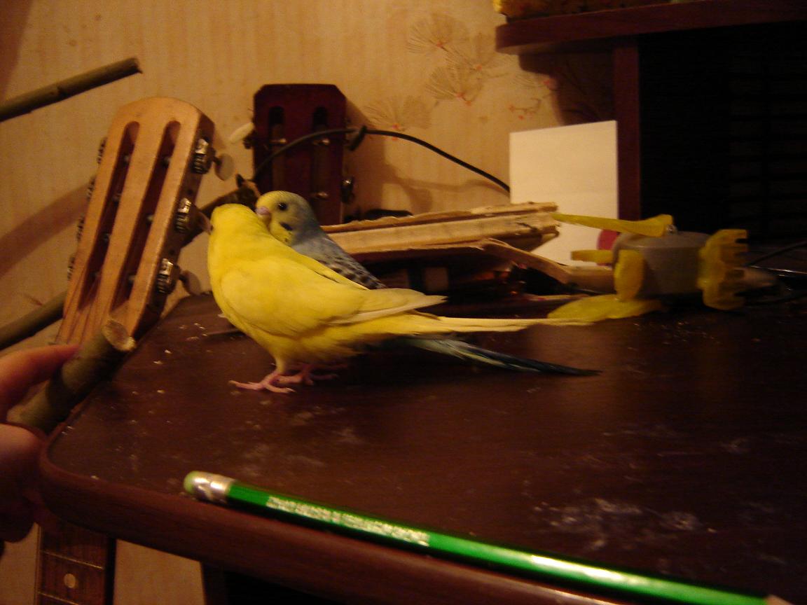 :sp: И кое что из жизни моих птиц..Вчера засыпая Чупа поднял одну лапку...Грише же приспичело покаать его высокий ранг в стае и поставить на Чупу лапу...в результате чего Чупа свалился с жердочки... А сегодня Гришенька занял все место на кормушке и ЧУпа который видимо тоже проголодался просто дернул Гриню за хвост)