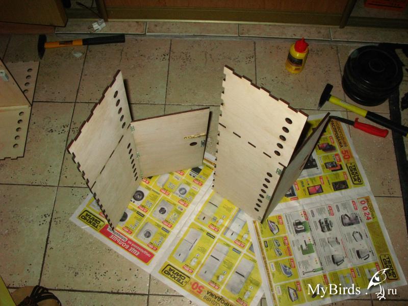 Бася Такая Опубликовано 18 августа, 2016 #1 Опубликовано 18 августа, 2016 Когда стало понятно, что переезд наших голубей в Черногорию возможен только на самолете, то встал вопрос о переноске. Понятно, что обычные не подходят - форма и габариты явно не те. Поэтому было принято решение сделать самим. Сначала позвонили в авиакомпании и выяснили требования, которым должна удовлетворять переноска при условии, что она будет считаться ручной кладью. Основных требований три:- изготовлена из прочных материалов (дерево, пластмасса, фанера и прочее), т.е. картон не подходит однозначно;- вес вместе со всеми питомцами - не более 8 кг (по факту получилось 5,7 кг вместе с сумкой и 5-ю голубями);- габариты максимальные 55х40х20 см (сначала нам сказали, что сумма размеров не должна превышать 115 см, но после того, как мы попросили уточнить - нам дали эти максимальные габариты). В качестве материала для переноски решено было использовать фанеру толщиной 6 мм. Внутреннее пространство переноски имеет три отделения, где можно перевезти три пары голубей. Но т.к. большинство стран считают перевозку более 5 птиц коммерческой - фактически мы перевозили две пары и одного голубя. Каждое отделение закрывается своей дверцей, каждая дверца имеет магнитную защелку (чтобы исключить случайное распахивание) и механическую защелку-засов. Непосредственно ручек дверцы не имеют - вместо этого используются круглые отверстия под палец. Сама переноска тоже не имеет ручки, поэтому потом для нее сшили чехол из джинсовой ткани. Под планируемую толщину фанеры я нарисовал чертеж, затем этот чертеж переслали в фирму, которая оказывает услуги по лазерной резке фанеры (использовать фанеру другой толщины нельзя - под нее расчитаны шипы). Работу вместе с материалом нам оценили в 1300 рублей. Через несколько дней после оплаты мы съездили и забрали нарезанные детали. Использованная фурнитура (куплена в Леруа-Мерлен):- петли 24х20 мм (использовано 9 штук - по 3 на дверцу)- три защелки мебельные 70 мм (60 мм корпус защелки и еще 10 мм выдвинутый язычок).- саморезы 2.5х10 мм.Инструменты:- шкурка 600 (или 800)- небольшая крестовая отвертка- клей ПВА (советую использовать быстросохнущий) и небольшая кисть- плоский надфиль, напильник- небольшие ножницы по металлу или обычные мощные ножницы (необязательно)- другая мелочевка (не помню, что еще использовал).Для усиления использовал штапик 10х10 мм. Ниже описан процесс сборки переноски в том порядке, как я его делал. Вполне возможно, что это слишком сложный вариант - я же собирал в первый раз, много чего додумывал, переделывал и уточнял чертежи "по ходу дела". Думаю, что проще будет сразу после предварительной сборки (п.2) полностью склеить и усилить корпус, а затем уже устанавливать дверцы на петли и защелки. 1. ПРОШКУРИВАНИЕ.Сразу после получения из резки все детали прошкуриваются шкуркой (600 - 800), чтобы убрать занозы и немного скруглить края. 2. ПРЕДВАРИТЕЛЬНАЯ СБОРКА.Предварительная сборка (без клея) выполняется для того, чтобы понять назначение каждой детали, определить ориентацию деталей и проверить совпадение шипов. Последовательность сборки - сначала на нижней детали размещаются перегородки и стенка смежных отделений (фото 4-1), затем устанавливаются стенки (фото 4-2, но без дверец), в конце сборки корпуса - оставшаяся стенка поперечного отделения. Дверцы просто примериваем и убеждае
