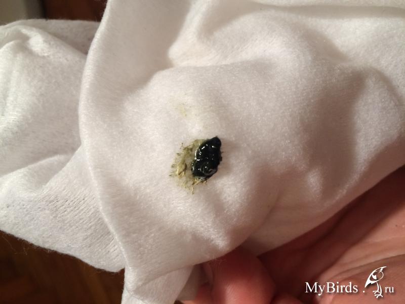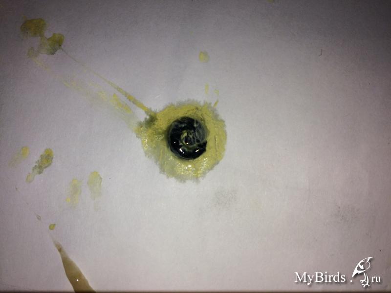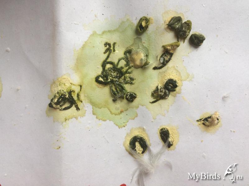 Алина_Нижний_Новгород Опубликовано 10 апреля, 2017 Автор #22 Опубликовано 10 апреля, 2017 (изменено) Дала нистатин пока один раз, кормила два раза, оба раза он срыгивает часть еды когда отпускаю его в клетку. Про помет за день сходил два раза, один белым пустым уратами, А второй вот фото , важно, что какашки как будто все в СЛИЗИ и не падают, а остаются под хвостом висеть, я убрала Ее вручную. Вот и вопрос что это может значить - слизистые какашки ??? Цвет -глубокий зеленый, НЕ черный. По прежнему не ест, сидит хохлится с закрытыми глазами, не реагирует на внешние раздражители. Изменено 10 апреля, 2017 пользователем Алина_Нижний_Новгород