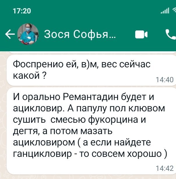 Мажу бетадином, дегтем, фукорцилом, череду,  после минут через 30-40 ацикловиром, 2 раза в день. Ацикловир утром и вечером в таблетках, для печени утром и вечером, утром фоспренил.