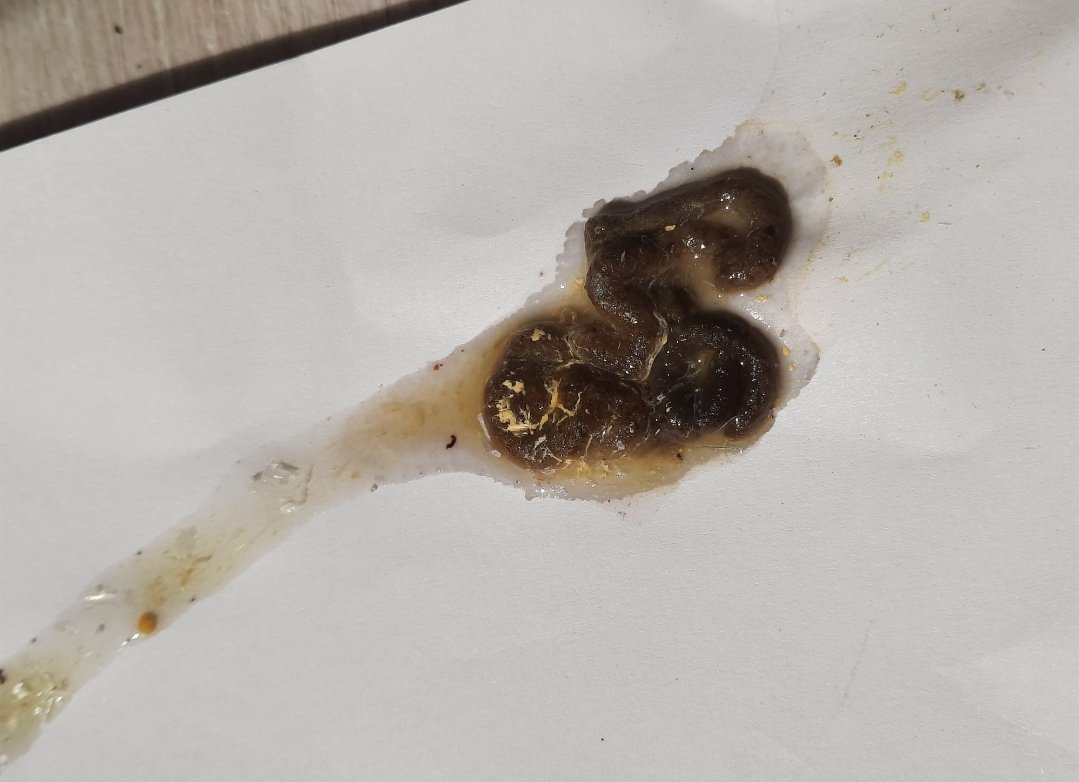 В общем кто-то его вчера точно кормил, потому что помет темного цвета.