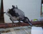 Всем добрый день. Два месяца мы тут не появлялись. Сначала лечились, потом востанавливались. Назвала я ее Сарой, но за это время вороша менялась внешне, менялось ее имя Сара – Саруля – Сруля…Вот небольшая фотосесия. post-72725-1510581295_thumb.jpg post-72725-1510581324_thumb.jpgpost-72725-1510581372_thumb.jpgpost-72725-1510581404_thumb.jpg Почему в природе не видно линяющих ворон, они стыдятся выйти «в свет» в таком виде? После болезни у нее остались небольшие залысинки и белые перышки вокруг глаз. А еще нет передних когтей на левой лапке и одного на правой. Это ей мешает полноценно держать добычу и крепко держаться за жердочки. Хвост отрастает, но какой-то обтрепанный, до полноценных перьев на крыльях, я думаю, еще далеко.. Летать она не может из-за отсутствия маховых перьев. Прыгает-скачет по балкону. Менялись за это время и ее причуды. Сначала ее любимым местом было ведро, на нем она и спала. Потом что-то произошло и ведро стало врагом. С едой тоже по-разному. Она любит есть из прозрачных пластиковых судочков, все что другого цвета вызывает недоверие. Мешанку ела так, что все (стены, пол) заплеваны. Стеклянную баночку с водой использовала и для купания. Голову засунет и плещется. Ставила ей для купания лотки и тазики разного цвета. Засовывает только голову. Но этого хватает наделать луж и забрызгать все вокруг. Но все же один раз ей удалось искупаться (не видела, но думаю что это произошло) так как после омовения она превратилась в почти полноценную ворону. post-72725-1510581436_thumb.jpg post-72725-1510581422_thumb.jpg А это вчерашнее фото post-72725-1510581478_thumb.jpgНо вот недавно ей в голову пришла «гениальная» мысль все мокать в поилку. Ну ладно – орешки, сухарики, косточки, мясо…Но зачем набирать полный рот творога, выпускать его в банку и потом вылавливать ???? И превращается моя воронка в утку. Как ей обеспечить чистую воду в поилке на весь день?