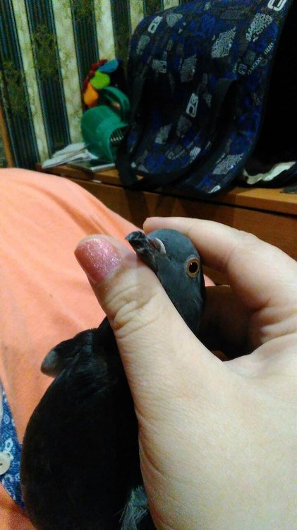 So1ne4naya Опубликовано 28 февраля, 2018 #1 Опубликовано 28 февраля, 2018 30 января мама около работы нашла, как мы сначала думали, замерзающего голубя. Поселили его в мягкой кошачьей переноске. На третий день стали замечать, что он стал держать неровно голову. А на четвертый день всю ночь шумел в своей переноске. Перестал есть. Почитала ваш форум (за что огромное спасибо) и принялась за лечение. Даем Пирацетам, витамины (B1, B6 и В12 - чередуем), Циклоферон и поим глицином. На поправку пошел буквально через неделю. Помню как я обрадовалась, когда он смог сам выловить и проглотить первое зернышко перловки. Стала во время кормежки садить его на стол и не держать. Под чутким наблюдением делал зарядку: потягивания, подпрыгивания и взмахи крыльями. Начал чиститься. Мама пару раз наливала ему более глубокие чашечки с водой и наблюдала, как он в них купался )))) Недели полторы назад стали пускать него гулять по комнате, а сейчас уже оставляем его "гулять" весь день. Иначе и не получится: с 8-и утра у него истерика в переноске. Бьется о стены и требует, что-бы выпустили. Вообще характерный тип. Постоянно рычит (даже и не думала, что птица мира может такие звуки издавать) и клюет руки. Неделю назад начал "петь" часа в 4 утра... А теперь вопрос: какие лекарства можно убрать или заменить? Голову он держит почти всегда ровно. Небольшая кривизна заметна только когда на шкафу сидит. Летает и приземляется четко. Прикладываю фото того, как у нас было вначале. Это его так скрючило, когда наша собака мимо прошла (((