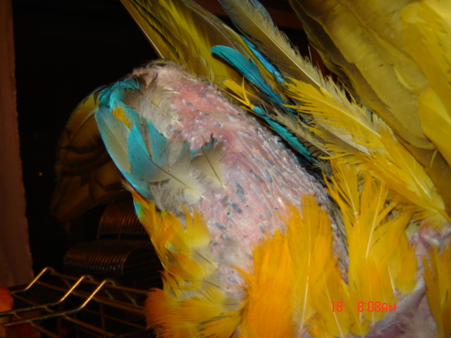 SOS !!!!!!!  Помогите кто-нибудь. Ара продолжает драть перья из спины и лап. Не знаем что делать.Подскажите хоть кто-нибудь что-нибудь. :bang: