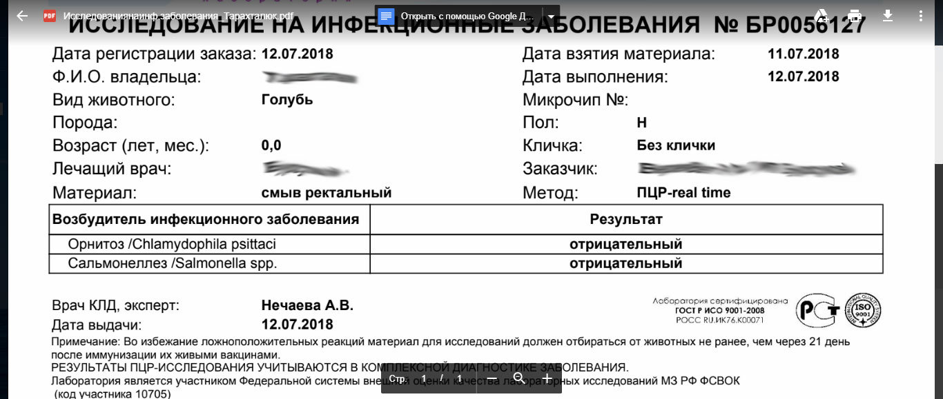 Razvodovsky Опубликовано 15 июля, 2018 Автор #6 Опубликовано 15 июля, 2018 @маленький принц Здравствуйте! Да, балкон застеклён. Дырки фото сейчас вышлю. За эти дни мы отвезли его в вет. клинику, они сделали анализы ему. Он полностью здоров . Файл прилагаю. В клинике нам сказали мазать левомеколем неделю, а там посмотрят что делать. Голубь выглядит хорошо, бодро. Каждый день мажем мазью. После мази он крыло опускает, видимо больно. Стал выходить из под тумбочки, сейчас каким то образом залетает на тумбочку, смотрит в окно. Косточка торчит. страшно. Ест хорошо. Как по закону бутерброда, самая ближайшая клиника орнитологии это Красногорск и там врач 2 недели будет в отпуске. В Сокольники везти очень далеко через всю Москву, сказали что стоить анализы будут 5 т.р. Крупы есть гречка, рис, пшено, горох, чечевица, манка. Ну как у всех дома. В клинике сказали пророщенным льном кормить. Пока неделю мазать, потом посмотрят. Но боюсь, что время будет упущено. Там же зашивать надо. 09.07.2018 в 16:37, маленький принц сказал: балкон надеюсь застеклённый чтобы птица не вывалилась? нужны крупные фото этой дырки со всех сторон запаха от дырки нет? семечек - не более 10 штук в день пшено лучше промыть и отварить на воде - без соли без сахара без молока дело в том что пшено это просо без кожуры а без кожуры у него жир на воздухе окисляясь прогрокает и может вызвать отравление у Вас какие ещё крупы есть? ВНОВЬ ЛЕТАТЬ и Здоровья Вашему голубю! PS нажмите пожалуйста наверху темы "подписаться" чтобы к Вам автоматически приходили уведомления об ответах