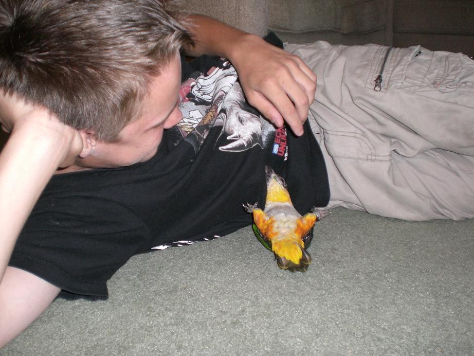 Badruskitty Опубликовано 11 июня, 2007 Автор #253 Опубликовано 11 июня, 2007 А каики звучат тише какадушек? но боюсь, что соседи мои рано или поздно узнают, что за "автономный пожарный извещатель" постоянно срабатывает в съемной квартире... и нашлют на мою нелегальную банду участкового...Лана говорит, что в ее случае фирменное звучание каиков не соседеопасно Да все совсем не так плохо . Мы уже с Ланой это где-то обсуждали. Выяснилось, что у нее каики громче Арчика (может потому что они в паре?), но все равно это терпимо. То что тише какаду - это 100%! И в магазине мне сказали, что каики не относятся к очень громким птицам. Арчик даже по утрам не кричит - так посвистит не громко и все . Арчи голосит громко только если что-то не так: одного в комнате оставили когда он того не хотел, что-то страшное в поле зрения появилось или еду не выдали во время (но это редко). В основном я его слышу когда ухожу из дома - он меня зовет назад и когда приезжаю и он слышит мою сигнализацию на машине - тогда тоже кричит, типа: "Ура, Маринка приехала!" . Ах да, еще он всегда громко чирикает (не орет, а именно чирикает) если слышит льющуюся воду (когда посуду мою или душ принимаю). Арчик ОЧЕНь любит купаться, поэтому и восторженно голосит при звуках воды. Но это все совсем не страшно и с соседями проблем нету. Хотя у нас тут стенны картонные в буквальном смысле этого слова и поутрам я иногда слышу соседский будильник. У меня в детстве было 3 волнистика, так они однозначно были громче моего Арчибальдика. Наверное это еще от попужкиного темперамента зависит?Так что Ален не боИсь. Я ни разу не волновалась о громкости моей пичужки, значит он не такой уж крикун. Вот нашла фотки Арчиного нового хобби - смотреть в окно. Сегодня соседи колесо на машине меняли, так мой красавец бросил есть и побежал к окну "процесс контролировать" и следил пока соседи домой не ушли. Вот такой вот птиц-автомеханик!