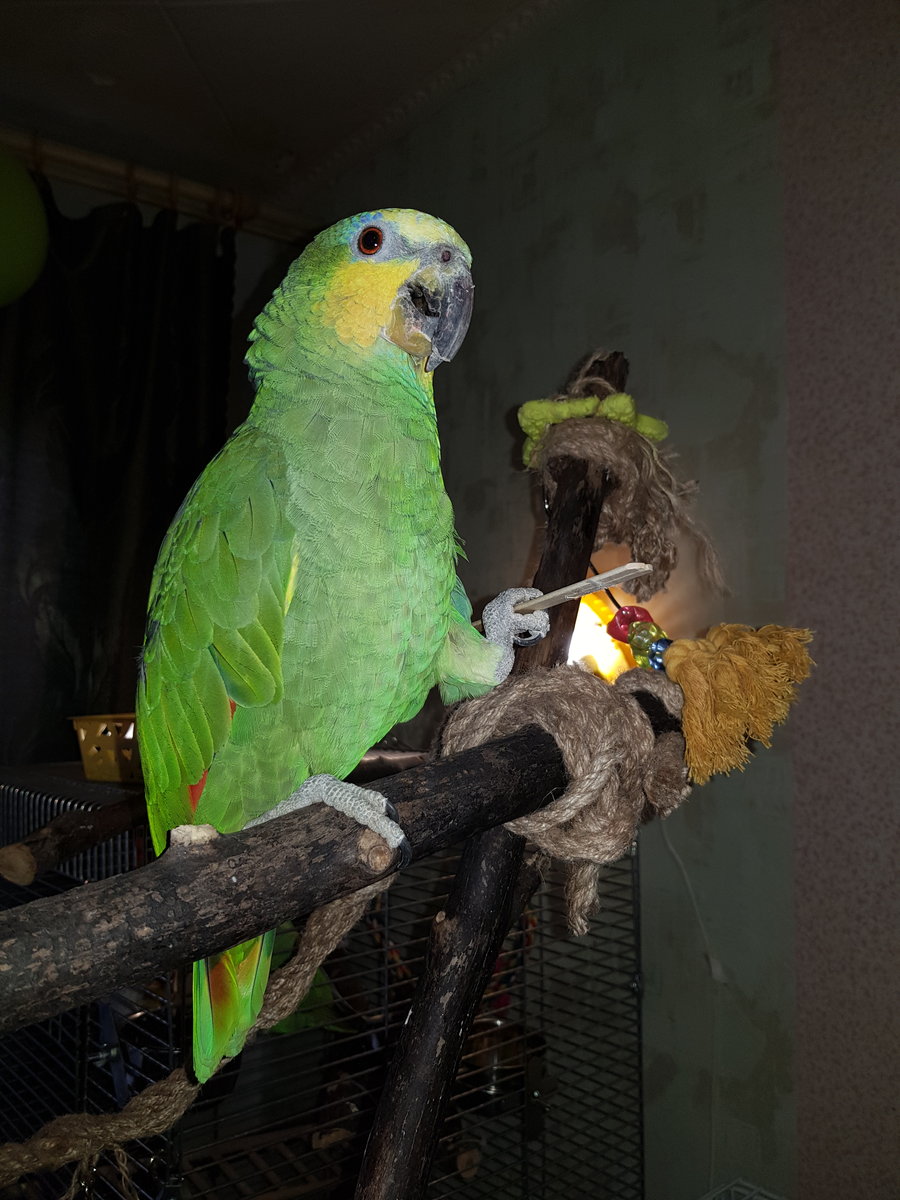 Здравствуйте! В моей стае прибавление. Степа- венесуэлец.  Знаю о нем мало.  Возраст 5 лет. Все 5 лет он провел в клетке,питался только сухим кормом. Клюв был длинющий, а ноготки даже заворачивались. Вызвала ветеринара,все что можно поправили. По анализам вроде тоже хорошо. У нас он уже месяц.Карантин продлился не долго. Любопытство ожерелика сводило с ума. Степа агрессию в сторону Юши не проявляет, но Юша как избалованный ребенок, так и норовит все отобрать и за хвост дерябнуть.  Кормлю его сейчас разнообразно. Распробовал кашки и замоченный корм. Фрукты и овощи ест практически все ,что дам. Киви как то не очень. Летать ему понравилось. Научился играть в игрушки. Любит,когда я в фантики вкусняшки заворачиваю. Любит когда я им пою( наверное только им и нравится). Прежние хозяева сказали,что он умеет говорить: " Степа хороший ". Но у нас он только на днях мой чмок передразнивал. Но есть вопросы. Как преодолеть страх перед ним. Я его боюсь. Занимаюсь с ним,даю кедровые орешки с рук,иногда берет с ладони,но боюсь его. Как его научить заходить на палочку или на руку? Он дико боится палочки. На руки рычит как злой тигр. Как его можно хоть погладить? Он всегда будет так строг ко мне? И еще. Второй день он как то странно иногда ведет себя,но только со мной. Я с ним ласково болтаю, прошу лапку дать погладить,а он в это время словно танец какой-то исполняет, головой как брейк выписывает и так нежно скачать начинает. Что это? Помогите мне ,дорогие форумчане.