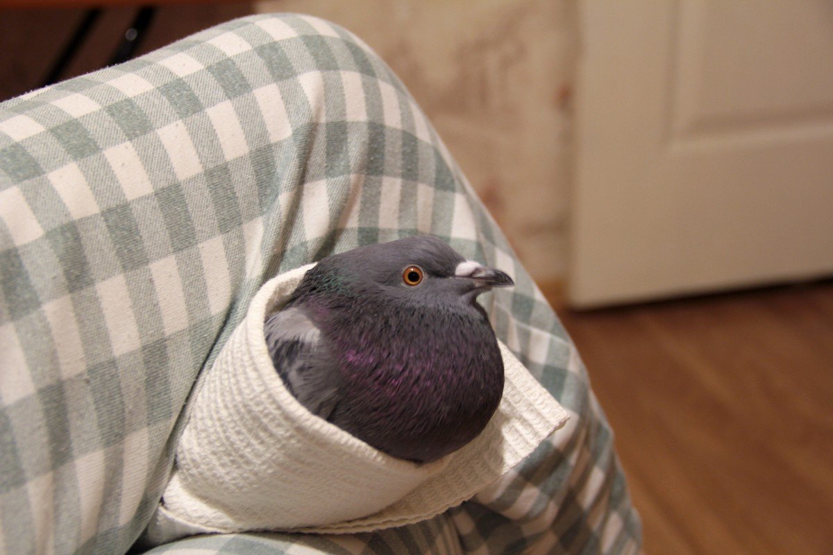 Паутина Опубликовано 12 ноября, 2018 #41 Опубликовано 12 ноября, 2018 46 минут назад, Lannna сказал: Только - можно пробовать клеить медицинским клеем? Он самый безвредный, подойдет он? Вот этого я не знаю, к сожалению. Я никогда не имела дела с таким клеем. Может, кто-нибудь другой что подскажет. Пошла сейчас, растолкала одного из своих пернатых, чтобы сделать фото "для науки". Вот как выглядит тот способ фиксации птицы с помощью ног, который я описывала выше. Кликните на фото для увеличения размера. У меня получилось, что птица располагается всё же ближе к коленям, но это вы сами опытным путём определите, как вам лучше. И на фото мой голубь замотан лишь по плечи, а вам явно побольше следует его замотать.
