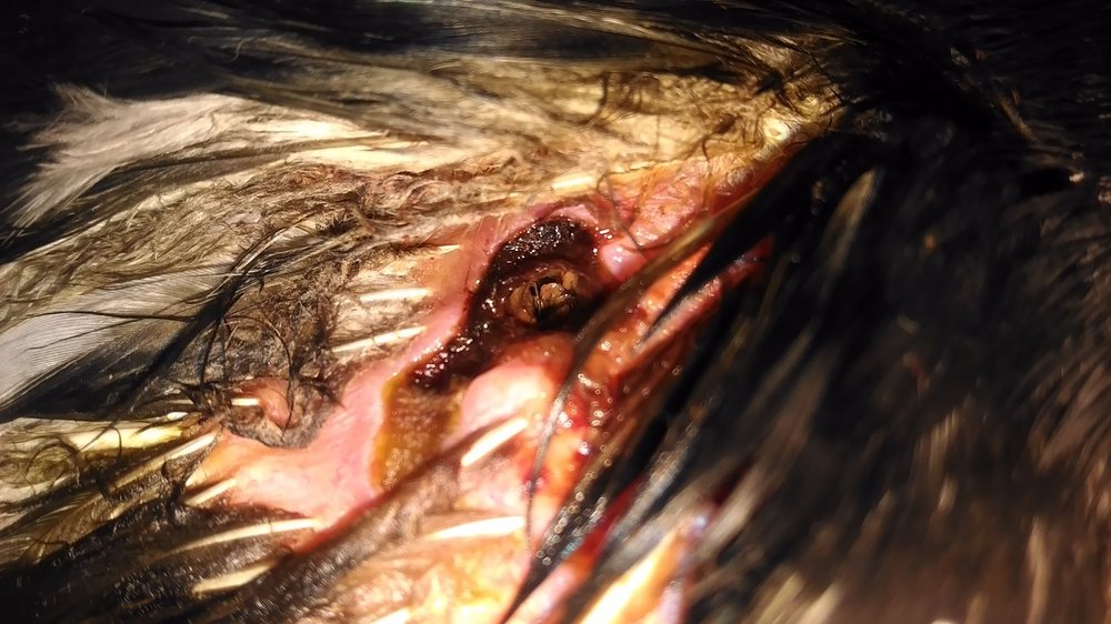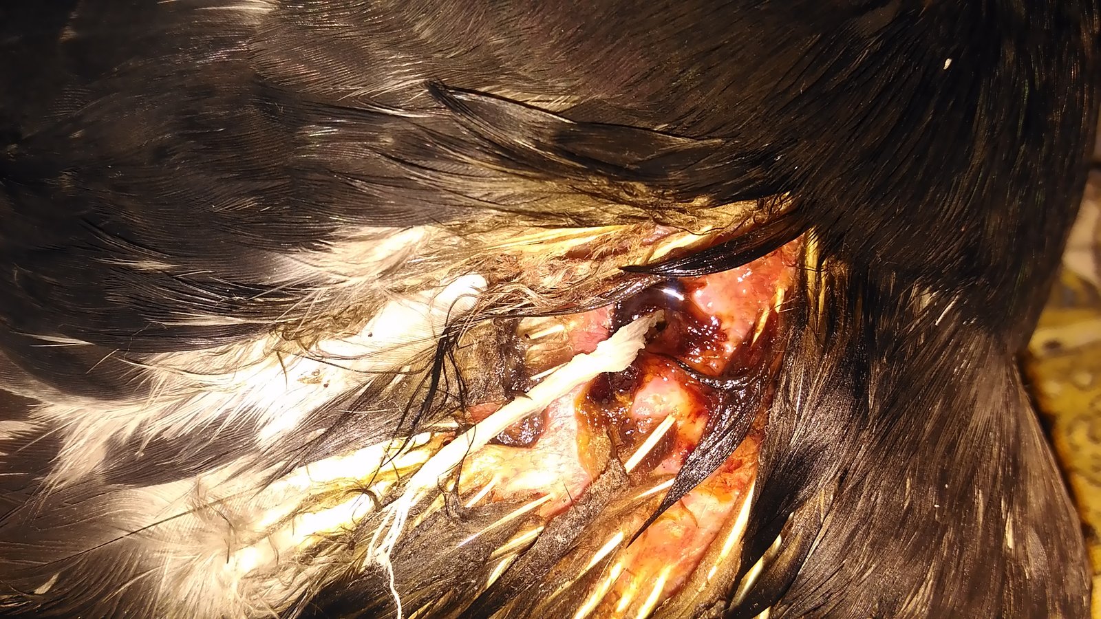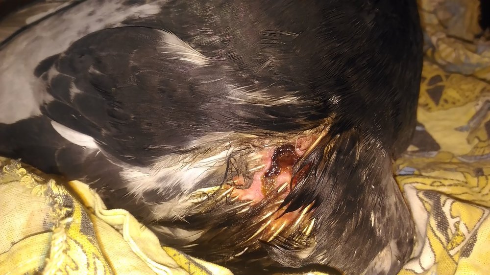 Krista Опубликовано 27 марта, 2019 #1 Опубликовано 27 марта, 2019 Добрый день! Зарекалась больше так не делать, но тем не менее. Подобрала нелетающего голубя, неподалеку бродила кошка, возможно лапой задела, рана не рваная, колотая. Отмыла запекшуюся кровь, на крыле ранка, небольшая, чистая диаметром 5-7мм, но глубокая, хлоргекседин, фурацилин заливается как в воронку. Нажимаешь на крыло с внутренней стороны - выливается. Заложила левомеколем. Зафиксировала клеевой повязкой. Трудно сказать, опухшее крыло или нет, возможно немного, рана рядом с плечевым суставом, не могу понять при сравнении со здоровым, одинаковые или нет. Крылом не шевелит, подвязала к хвосту. Голубь крупный, упитанный, оперение хорошее, ест хорошо, помет нормальный. Не очень активный, сидит в коробке, когда не ест. При манипуляциях не сопротивляется и не рычит. Больше всего беспокоит, что рана длинная и узкая, видимо, нужно сделать дренаж, киньте ссылью как и чем его делать. Если есть предложения, что еще можно сделать - милости просим.