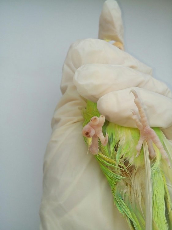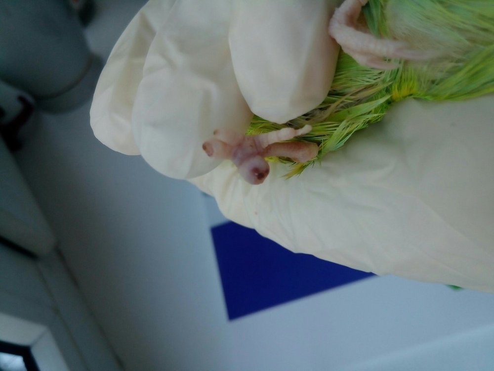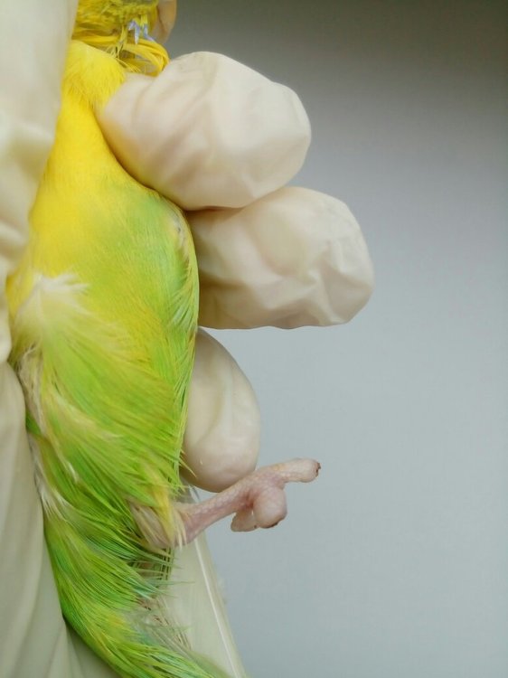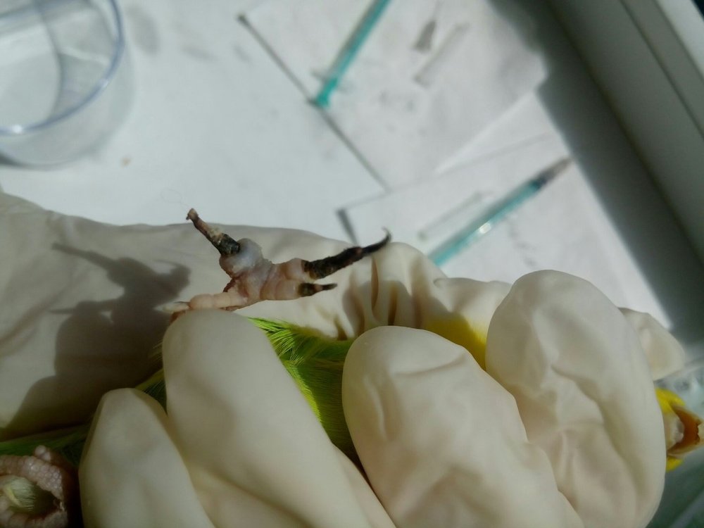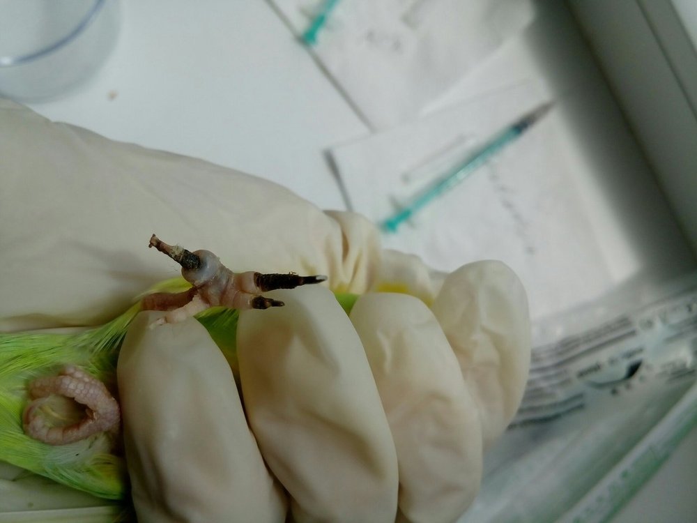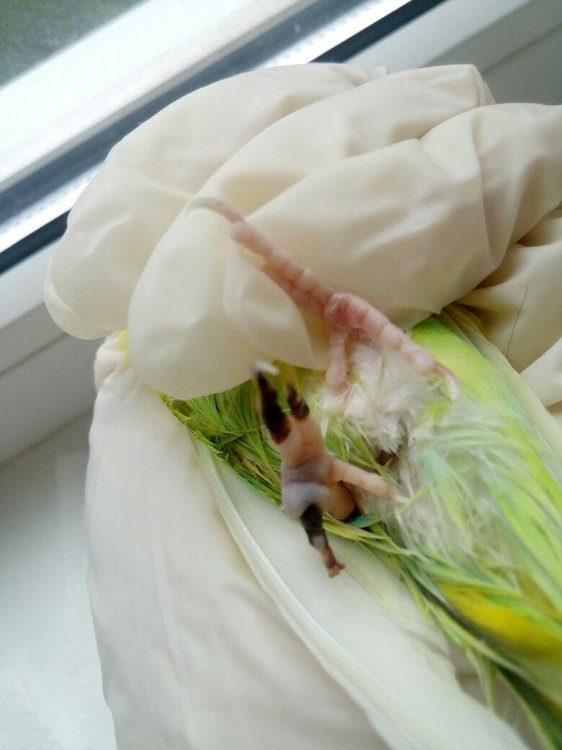 Летка Опубликовано 20 апреля, 2019 #1 Опубликовано 20 апреля, 2019 Всем привет! Ребята, опишу ситуацию: У моего волнистого попугая (самки) гангренка пальцев на одной лапе. Подозреваю, что кошка могла играючи придавить лапку, когда птица прыгнула на вертикальную плоскость клетки. Заметила не сразу, т.к. она все время прячет одну лапку под себя (делала так всегда, еще до болезни). Паличики почернели, уже высохли. Есть отек на стыке мертвой и живой ткани. Иногда погрызывает эти отмершие пальцы, меньше опирается на эту лапку. Обратилась к местному орнитологу. Посмотрела птицу, назначила "Травматин" по 1 капле в клюв 2 раза в день, "Троксевазин" местно 2 раза в день. Сказала надо удалять лапки, но у нее нет такой практики. И в городе никто не делает, не занимаются птицами настолько!!!!!!!!! Еще сказала, что мы можем поддерживать кровообращение живых тканей, а птица сама откусит пораженные пальцы. Делаю все по ее рецепту 5-й день. Сегодня отправила ей фото лапки, т.к. отек не сходит и меня это настораживает. Сказала, попробовать еще один компресс: сначала обрабатывать лапу теплым хлоргексидином, затем раствором диоксидин 3 мл.+новокаин 2% 1 мл. - 3-4 раза в день, и после этого сразу мазать мазью "Ируксол". Все мазать 3 дня. Говорит, попробуем лечить консервативно, если нет, то удалять только. У меня паника при такой мысли, что специалиста нет, а делать это самой! Искала в городе эту мазь-тщетно. Смотрела цены в нете - кусачие. Но если это поможет птице, купила бы. Может быть есть какой то аналог? Или только эта мазь такая эффективная? Подскажите, дайте совет пожалуйста! Уже и не знаю куда обращаться. Прикреплю фото лапки на всякий случай. Фото сегодняшние.