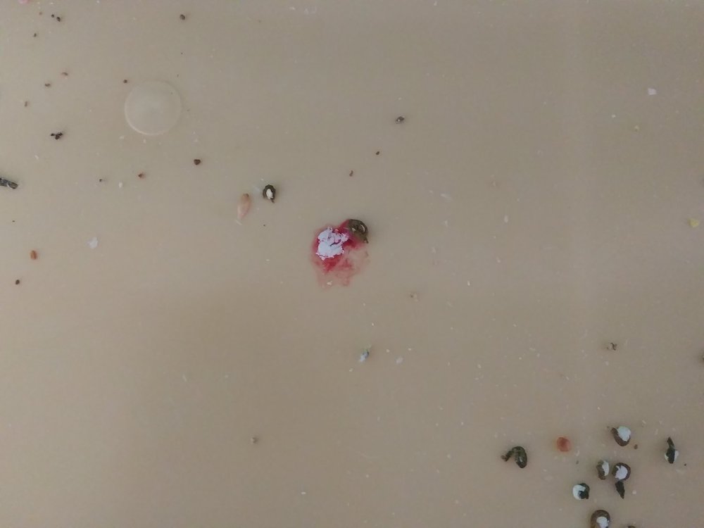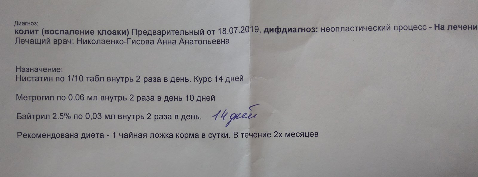 Последние две недели заметили, что к клоаке прилипает помет, попугай периодически сидит и рьяно его очищает. Три дня назад на поддоне была замечена капля крови, а после приглядевшись к помету, увидели кровь и в нем. Однако кровь появляется не в каждой кучке, что следует из результата общего анализа кала. Сегодня были на приеме у орнитолога, был взят анализ, который не показал кровь в содержимом. Вернувшись домой, на поддоне опять был замечен помет с примесью крови, в результате собран и доставлен в ветклинику. По результатам нам сказали, что это скорее всего опухоль, назначили лечение.