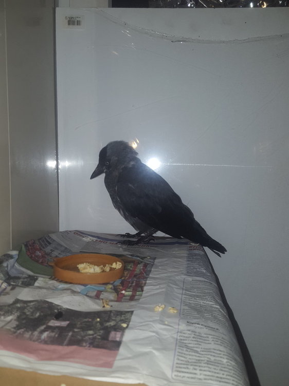 Всем привет! Нашел галку, у меня она-одни сутки, с возрастом определиться не могу, не летает, ест хорошо, практически не боиться(лазит по мне как у себя дома) ест хорошо. Да, звуков не издает почти(только когда какает может пискнуть)