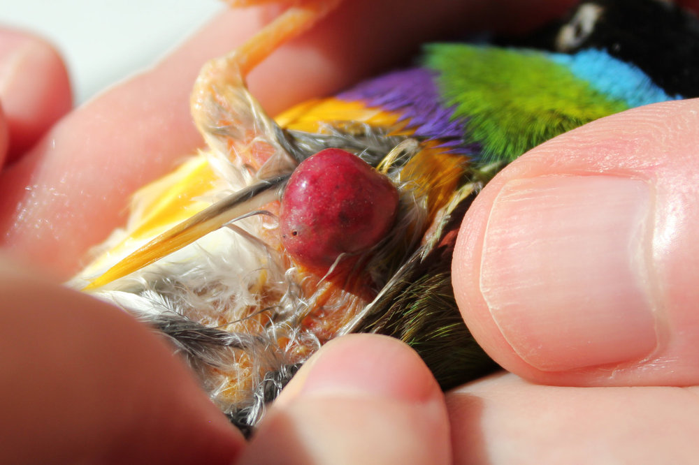 Nightshimmer Опубликовано 5 июня, 2020 #1 Опубликовано 5 июня, 2020 Добрый день. Буду очень благодарна за любые направления и подсказки. Амадина Гульда, самец, 2016 г.р. Питание: зерновая смесь Deli Nature для амадин, пророст/замочка (та же зерносмесь плюс гречка, маш, редька, пшеница, сафлор, чечевица), чумиза, чиа, овощи (в основном морковь, кабачок/цуккини, огурец, сладкий перец, по сезону - кукуруза в кочане) и листовая зелень (разные виды салата, шпинат, эндивий, руккола); витамины Oropharma Omni-Vit 1 раз в неделю в поилку, Calci-Lux аналогично; сепия, минеральная смесь (8-in-1 Ecotrition плюс Versele-Laga Grit) + раз в несколько месяцев "присаливаю" смесь порошком ламинарии или спирулины. Клеточное содержание (Ferplast Piano 6), птичья лампа Trixie, активный световой день в данный момент 12 часов, температура и влажность обычные комнатные (в районе 20-23 градусов и 40% влажности; раз в день пшикаю в комнате из пульверизатора). Сегодня проводила повторную обработку ивермектином от трахейного клеща и обнаружила большое новообразование у основания бедра. Десять дней при первичной обработке назад оно если и было, то раза в три меньше, иначе заметила бы. То есть оно сильно вымахало буквально за неделю. Новообразование мягкое и подвижное, цвет плюс-минус такой же, как на фото (освещение на фото естественное без вспышки). Птица ест, пьет, двигается, но при отлове заметно, что ослаблена. Из сопутствующего - моя стая скорее всего заражена полиомавирусом. Сейчас ни у кого симптомов нет, но несколько лет назад одна из птиц умерла с симптомами, которые тяжело трактовать иначе. Ничем не лечила, ничего не делала. Нахожусь в состоянии паники, потому что не знаю, какие у этого прогнозы, куда бежать и что делать. В городе, где я сейчас живу (Украина, Полтава), наблюдается проблема с ветврачами-орнитологами, иначе сидела бы уже в клинике. Я понимаю, что определить характер новообразования и дать прогнозы без гистологии или хотя бы биопсии практически нереально, но я даже примерно не представляю, куда за таким обратиться и возможно ли лечение у таких маленьких вообще. Если невозможно, то я хотела бы обэтом знать. Если есть какие-то процедуры или диагностика, которую можно попросить провести в обычной кошачье-собачьей ветклинике, то с радостью это сделаю.
