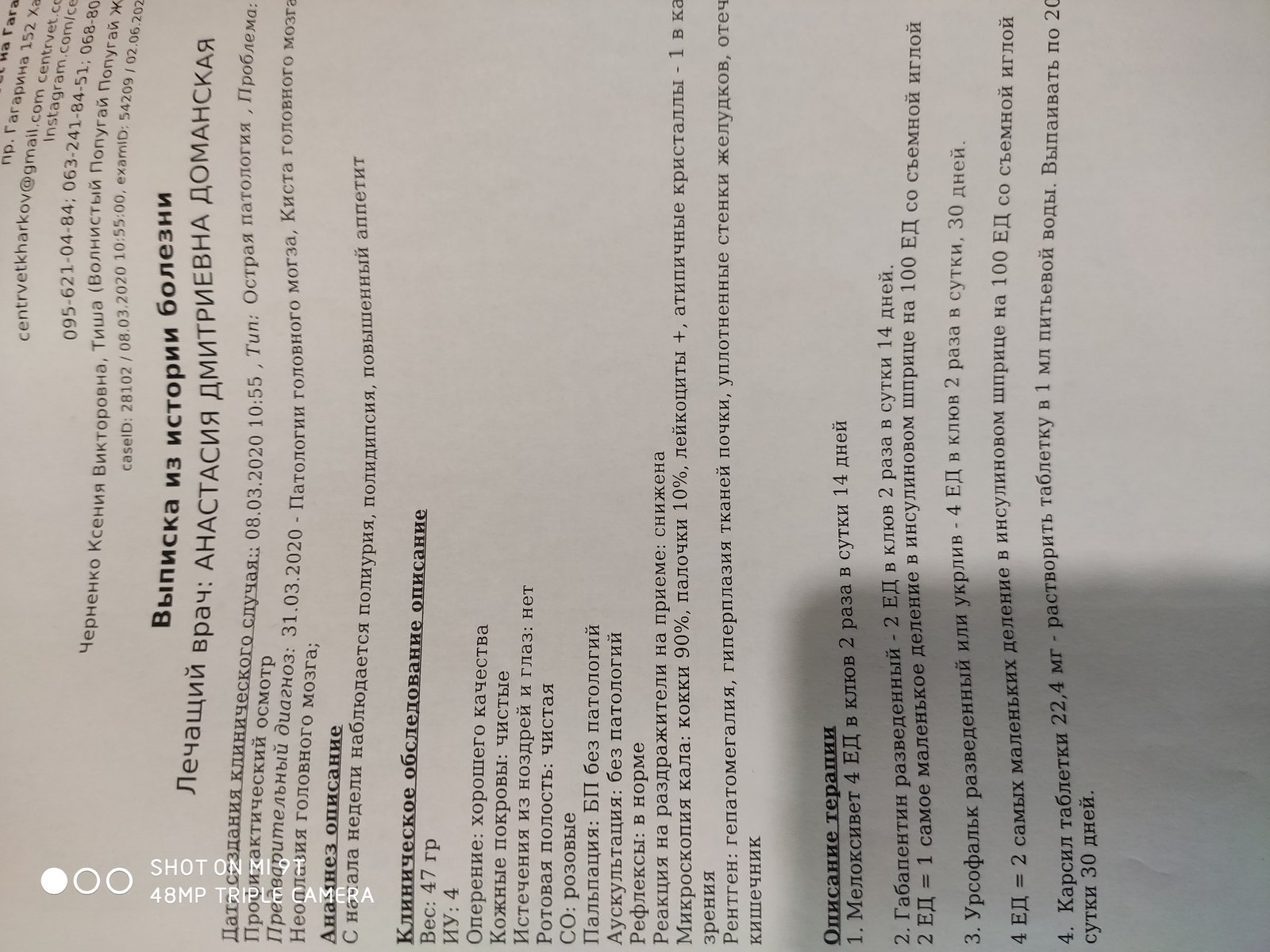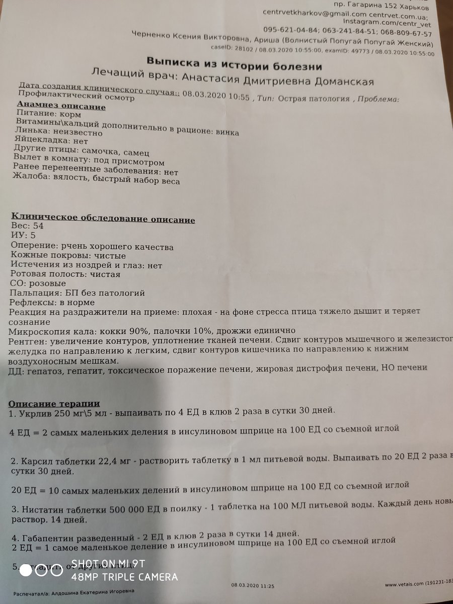 Ксенияchernenko Опубликовано 8 июня, 2020 #1 Опубликовано 8 июня, 2020 1. Возраст, пол. 2года 9мес 2. Как давно у вас птица? 2 с половиной года 3. Как давно болеет? Февраль 2020 4. Какие симптомы и подробно, что случилось? В начале года сильно набирал вес (52-56 грамм), не могли похудеть, стал очень нервным, в марте неудачно упал, потерял зрение, по рентгену было видно увеличенную печень, которая давит на желудок и воздушные мешки, помет был в норме, пьем мелоксивет и габапентин постоянно, было 2 курса по месяцу Укрлива для печени, 1 курс карсила. Во время второго курса Укрлива начал какать с водой. Думали морковка плохая попалась, давали Энтеросгель отдельно от других лекарств, позже увидели, что пьет очень много воды. Изначально подумали что от голода/жадности (у него повышенный аппетит, кормили 2 ч. ложки на 7-8 приемов каждые 2 часа, 1-2раза из которых ночью). сделала глюкотест мочи - повышена. Опускает крылья, правое ниже левого. Когда сидит скрещивает их под хвостом, когда ходит - нормально держит. Голова преимущественно наклонена влево, иногда ровно держит часто дрожит, много спит, не хохлится, хвостом дёргает. Перестал разминать крылья. 3 дня назад ночью были судороги, принимали глюконат кальция и мильгамы, в поилку глюканат и витамины трикси. После приступа был как овощь, сейчас немного лучше, аппетит уменьшился, жажда - нет. Ленится лущить зерна, каши с ложки кушает сам. Последний рентген показал ещё большее увеличение печени и почки неправильной формы. Анализ крови на глюказу -норма, мочевая кислота понижена. 5. Изменился ли помёт? Да, с водой. Колличество воды в помете регулируется колличество выпитой воды, даём поилку 6 раз в день по несколько глоточков. Пришлите фото. 6. Была ли рвота? Нет 7. С чего началась болезнь (смена корма, простудился, ушибся, съел что-либо подозрительное и т. д.)? В п.4 написала 8. Чем лечили? Обращались ли к врачу? обращались по потере зрения и травмв после падения и с лишним весом.- ДД -новообразование ГМ, печени. 9. Что мог погрызть (комнатные растения, обои, любой предмет)? Ничего. Гуляет по дивану под строгим контролем 10. Пользуетесь ли дезодорантами в комнате, химикатами? Фумигатор? Нет 11. Где живёт птица (кухня, комната)? Спальня 12. Расскажите о питании: Падован натурал, сепия и глина есть, но не грвзет, салат домашний, морковка, яблоки, тыква, свекла, рис, гречка, чумиза, перец 13. Какую воду даёте (водопроводная, фильтрованная, кипячёная, если покупная, какая)? Как часто меняете воду в поилке? Бутилированная Сатис. Меняем 1 раз в день. 14. Какая упитанность? Худой или полный? Взвесьте птицу. Февраль 56 Март 50 Апрель на тощак 46-47, на ночь 48-50 Когда начал пить много утром 48, вечером 50 Сократили количество воды - утром 44, днём и вечером 47 Сейчас тоже 44-47 15. Сколько часов составляет ночной сон? Выпускаете ли птицу из клетки и сколько часов в день гуляет? Сон 12 часов +-, но часто спит днём и бодрствует ночью. Не летает, бо слепой, часа 1,5 -2 в день топает или сидит у меня на пальце 16. Содержится ли птица одна? Если есть другая птица (птицы), каково ее (их) здоровье? Есть ещё 2 самки и 1 самец, у одной самки ринит, по пищеварению всё хорошо, все чувствуют себя хорошо 17. Не появлялись ли в доме новые птицы в последние два месяца? Если да, то подробнее об этом. Нет 18. В доме есть другие животные? Если да, укажите, какие, и контактируют ли они с попугаем. Нет Может есть ещё шансы как-то помоч