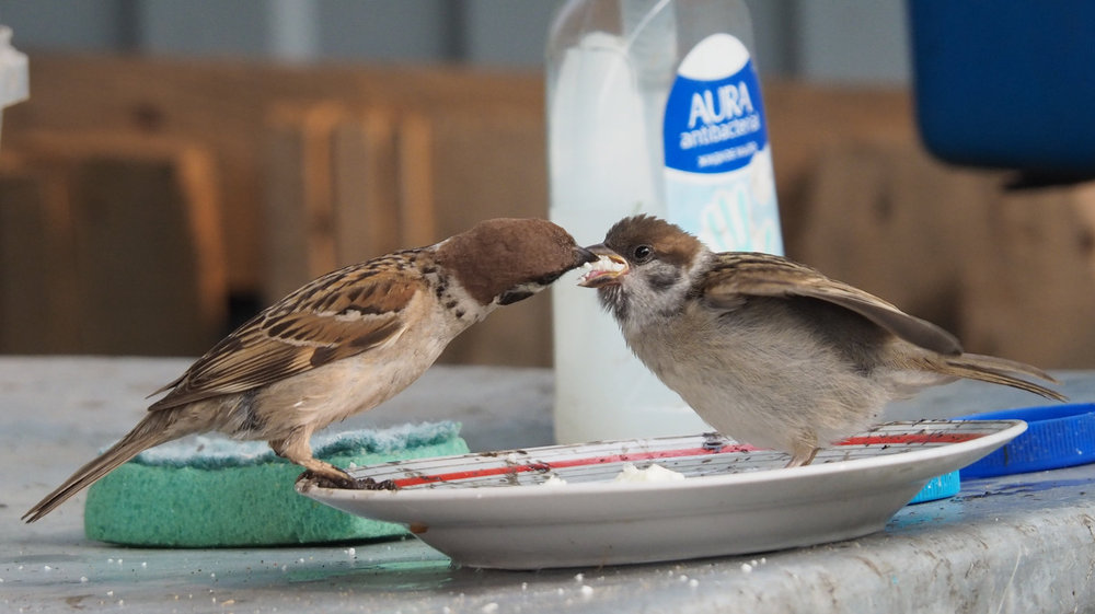 С дерева начал(а) ему носить еду и отгонять других взрослых воробьев. Сам птенец тоже на взрослых птиц нападает, но они просто отпрыгивыали, не задирали его.