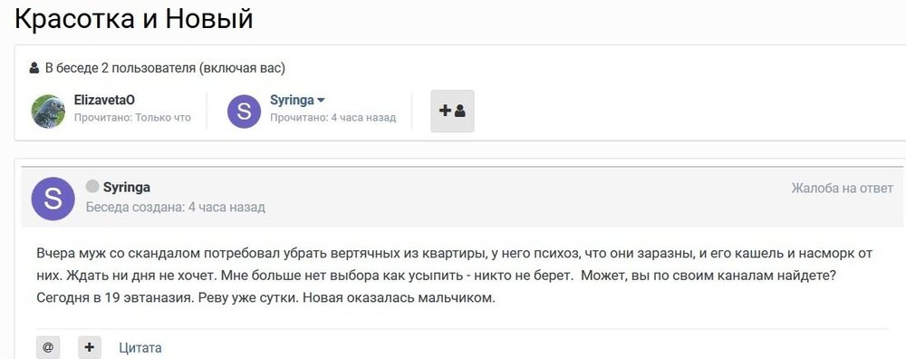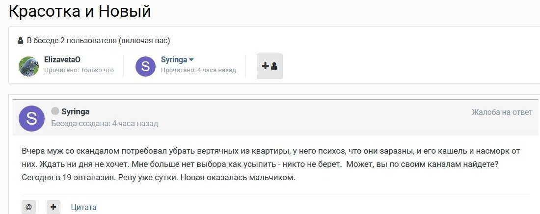 ElizavetaO Опубликовано 20 декабря, 2020 Автор #1038 Опубликовано 20 декабря, 2020 (изменено) Через день исполнится ровно полгода с тех пор, как я решила завести здесь свою тему, которая в какой-то мере является моим дневником. Параллельно девочка Digi начала вести "Дневник приручения", - теперь ее тема называется иначе. "Моя любимая стая: прошлое и настоящее" - название всьма условное, поскольку в этой теме речь идет обо всем, что связано с голубями и, вместе с тем, отражается и мое видение мира, а также - понимание Добра и Зла. Впрочем, частенько мне случалось какие-то мысли в этой связи высказывать и в других темах и, может быть, в моей их оказалось даже меньше, чем мне хотелось бы. Я ничего не перечитываю из написанного, - пока что все очень еще свежо в памяти... Было много-много всякой всячины, - больше всего жалею я о том, что мало, слишком мало фотографировала своих голубей, что почти не снимала роликов с ними. Сегодня, вопреки своей излюбленной манере, воздержусь от вклеивания смайликов. По одной причине: я получила личное сообщение от пользовательницы под ником Syringa, которое привожу здесь в виде скриншота, ибо ничего личного в нем нет /все то же самое написано ею на другом форуме открытым текстом и разница заключается лишь в том, что в этом сообщении упоминаются какие-то мои "каналы"/: Вот - текст сообщения отдельно, в увеличенном виде: Каналов, увы, у меня никаких нет, - я в свое время обратилась к Syringa исключительно потому, что мне было жаль травмированного голубя с недолеченным глазом, которого грозились выпустить зимовать на воле в Новосибирске. Здесь, на mybirds.ru, больше не к кому было обратиться, как и на ptic.ru, и я очень обрадовалась, что Syringа оказалась человеком сострадательным. Вот, собственно, и все... Изменено 20 декабря, 2020 пользователем ElizavetaO