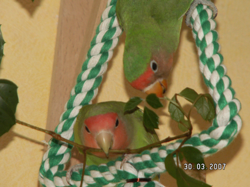 Prizrak123 Опубликовано 2 апреля, 2007 #9 Опубликовано 2 апреля, 2007 Привет всем! А мои что вытворяют!!! У ребенка каникулы целую неделю были, так он с утра открывал клетку на весь день. Только дверь на балкон открывал, так эти "термиты" уже там. Сидят воробьев дразнят . Воробьи.... те вообще с ума посходили от наших Порхают около окна и чирикают. А наши птички им подражают... воробьи все ветки дерева облепили Нашли на балконе коробку из под монитора, а в ней пенопласт (кстати, пенопласт я думаю им вреден?)... что тут началось!!! Лоло на стреме, а Пепе в коробку... потом и Лоло к ней... в общем они в этой коробке этот пенопласт с боооольшим удовольствием грызут . А еще мы выносили на балкон хомяков. Так птички наши, садились на домик и начинали хомяков будить. В общем балкон теперь принадлежит - попугаям!