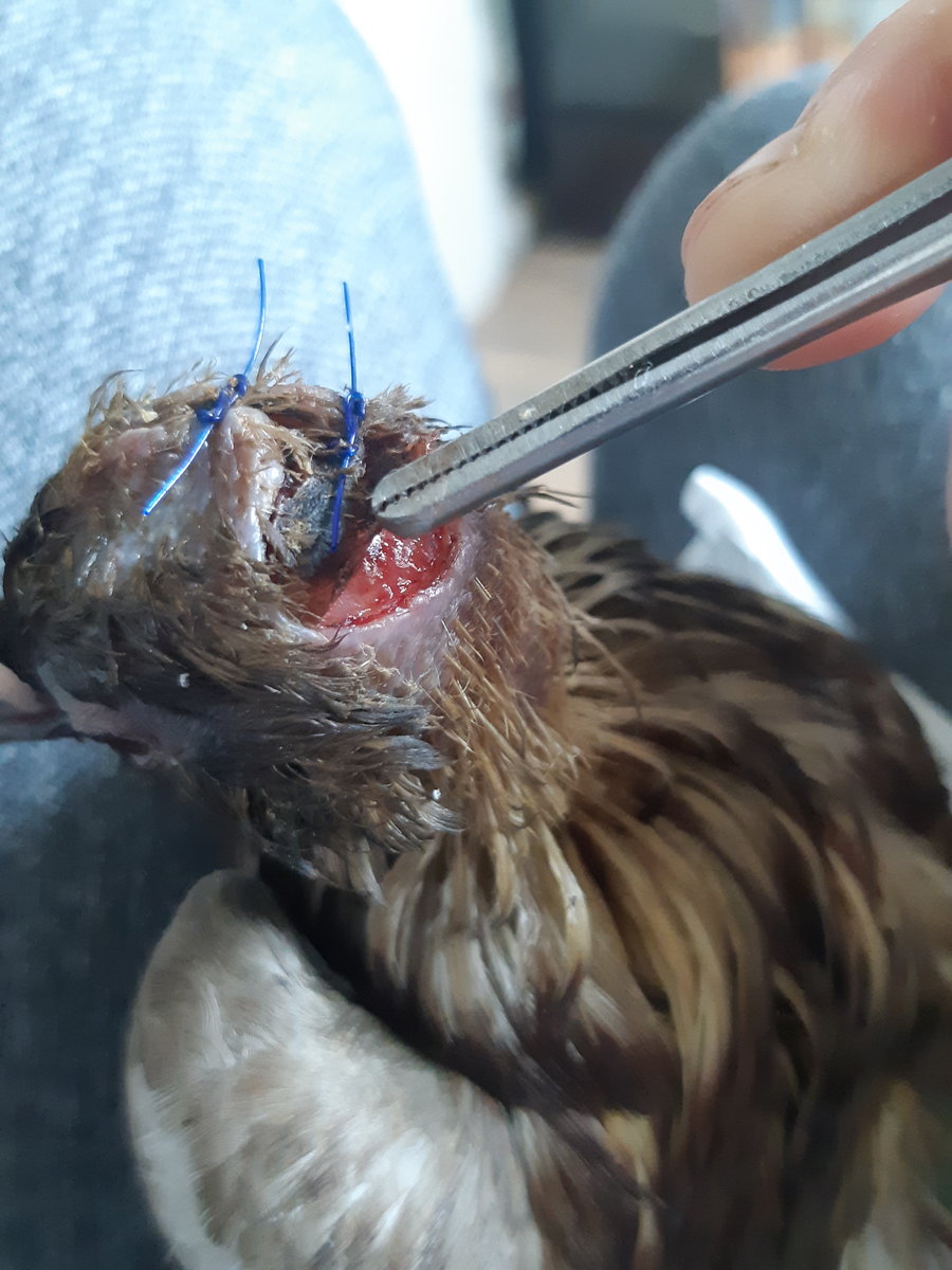 На 10-й день были яастично сняты швы (самые толстые), зачищена рана, где произошло частичное отмирание кожи. Весь инструментарий был облит спиртом и подожжен, дабы убить всё живое, что там могло быть, потом остужен. К ране был приложен ватный тампон с теплым хлоргексидином и подержан несколько минут для размягчения: