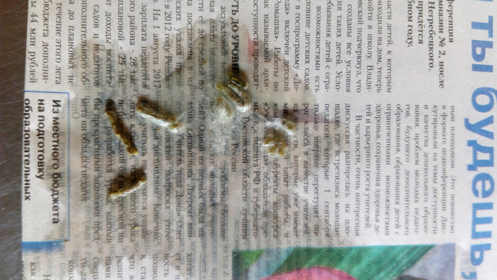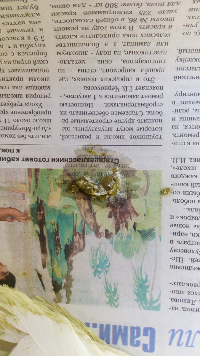 Елена 261184 Опубликовано 13 августа, 2020 Автор #11 Опубликовано 13 августа, 2020 Утром опять сидел на банке с водой. Крылья опущенные, постоянно сидит. Фото ночного помета, вкрапления на фото 2 - это просо. В зобе была еда, то ли сам ел, то ли осталось то чем я его вчера насильно кормила. Сегодня дала ему 5 мл. пшеничной каши и 10 кукуруз. Из лекарств: фоспренил, гамавит, энрофлон. Очень, очень жду ответа специалистов.