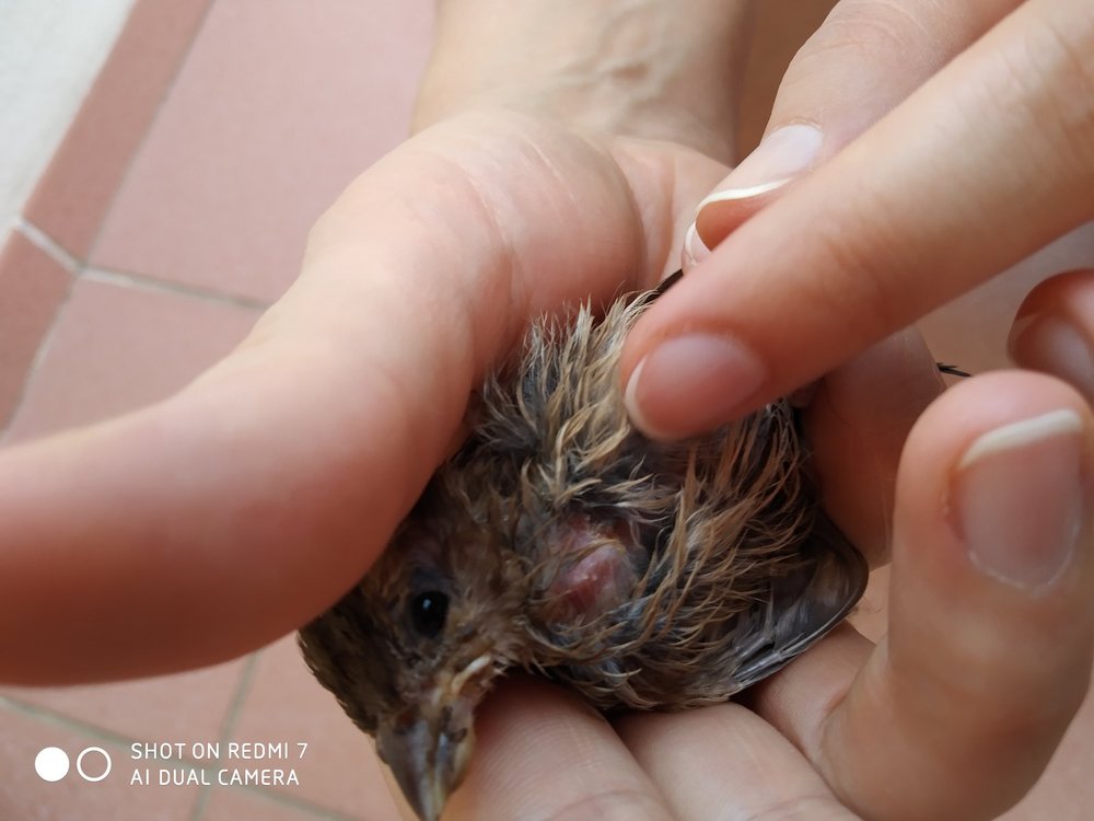 Здравствуйте, помогите вылечить птенца воробья. Неделю назад я обнаружила у себя на балконе птенца воробья. Я его не трогала, т.к. к нему по очереди прилетели родители и кормили его, я надеялась, что в ближайшее время он улетит. Но спустя неделю этого не случилось, птенец стал не очень активным, когда я его взяла в руки для внимательного осмотра, то обнаружила, что у него голое тельце под крыльями и какие-то корки по поверхности тела и у основания перьев, которые присутствуют. Фото приложила, подскажите, пожалуйста, как ему помочь? (Он мокрый, т.к. был дождь)