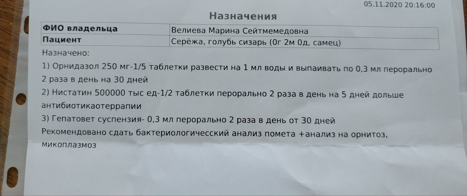 Марина Велиева Опубликовано 7 ноября, 2020 Автор #58 Опубликовано 7 ноября, 2020 (изменено) @OFA Ужас - получается у него могут быть наросты и на печени и в кишечнике, но голубенок набирает вес и чувствует себя хорошо и помет хорошиий. ?? Лан будем лечить , спасибо ? Здравствуйте , Голубенок чувствует себя хорошо , снова даем орнидазол ( 12 дней) и подключили амоксицилин.(10дней) Флуконазол 50мг/5мл даем по 0,2. Карсил. Вес 290 гр. Заметили что кожа на входе в трахею, в гортани как бы побелела - подскажите стоит ли волноваться ? У птички ломается голос -" гулит" потихоньку, но хрипло. Или это нормально ? Бугорок в горле так и прощупывается, никуда не исчез (((( Изменено 1 октября, 2013 пользователем Марина Велиева