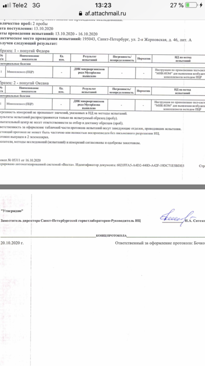 EkaterinaAbakumova Опубликовано 21 октября, 2020 #1 Опубликовано 21 октября, 2020 Здравствуйте! Лечу двух Гуленек - Оксаночку и Федорушку. Оксана у меня с конца июля. Лечили трихомоноз и микоплазму (не по анализам, а по симптомам, не сразу поняли, что это). Орнидазол 10 дней, пимафуцин на протяжении всего лечения + 4 дня, амоксиклав 10 дней, сумамед 14 дней. Все симптомы ушли во время лечения сумамедом. Изначально она попала ко мне с закисшими отёкшими глазками (пёрышки все были чистенькие) и слизью в горле, был запах от помёта (поэтому, возможно ошибочно, я и предположила трихомоноз) ,не всегда могла пищать, были приступы глотательных движений, во время которых слизь подступала к горлу и носу. Глазки стали проходить на амоксиклаве, но не до конца. На сумамеде всё ушло. Сейчас у Оксаночки,ттт, никаких симптомов нет. Федора у меня с 10 сентября, были наросты в горле, похожие на ранки, фото прилагаю, голоса не было, потом запах от помёта, лечила орнидазолом 14 дней, пимафуцин 14 дней. Думала голос восстанавливается, он стал лучше, но до конца не восстановился. Кроме того, когда полетает чуть больше чем пару тройку перелётов по комнате (когда мне ей лекарство надо дать, например) у неё отдышка. Дышит некоторое время с открытым клювом. Потом всё нормально, горлышко красное рыхлое. Периодически издаёт негромкий звук -пыф (как отрыжка).Бывало, кушает-кушает, потом шею вытягивает и некоторые зёрнышки вылетают. А по-началу вообще кушать трудно было ещё и из-за наростов, раздувалась вся. Наросты отпали, остальные симптомы до конца не прошли, поэтому поехали к доктору. Оксаночку даже брать не планировала, только в последний день решилась. В итоге ей, послушав обеих птиц, врач сделала рентген Оксаночке (фото прилагаю). У неё прослушались сухие хрипы с одной стороны, и жёсткое дыхание с другой. У Федоры жесткое дыхание с одной стороны, рентген не делали. Обеих пшикнули Фипристом 1 раз на кожу.Лечение тоже выписали одинаковое:1.Доксициклин (доксифин) 100мг растворить в 5мл воды,давать по 0,3мл (Оксаночке 0,28мл) внутрь - 2 раза в сутки,21 день2. Толтарокс 5% 0.15 мл (Оксане 0.14мл) внутрь 1 раз в сутки, 5 дней3.Дирофен 20 (паста или суспензия) 0,3мл внутрь, 1 раз в сутки, 3 дня4. Нистатин только Оксане прописали, но сказали, что и Федоре я могу его давать. Доктор сказала, что он транзитный, на печень не влияет,а пимафуцин не работает. На доксициклин у Оксаночки была реакция (видео прилагаю, если приложится). Спрыгнула слизь с кровью, это не симптом, такого не до не после (ттт) не было, а именно реакция на препарат. Его обеим поменяли да ципрофлоксацин. Таблетки 500мг, 1/2табл растворить в 6мл воды, 0,26 мл Оксане (она весит 280 грамм), 0,3мл Федоре (она весит 300 грамм), 2 раза в сутки Противопаразитарные на третий день (тоже обеим) отменили, т.к. Федорушку тошнило из-за них. В один из разов когда тошнило Федору, она тоже вытошлила немного слизи. Нистатин у нас не продаётся, даю Флуканозол. Капсула 50мл /5 мл воды, по 0,3 мл /2 раза в день. Сегодня 5й полный день приёма ципрофлоксацина. У Оксаночки восковица была белая до начала лечения, после доксициклина и реакции на него - порозовела. Сейчас чуть менее розовая, но не белая. Видимых симптомов у Оксаны как не было, так и нет. Федорочка «пыфает», при полётах отдышка ещё есть, но кушать стала не вытягивая шею, зерна не разбрасывает. Купила стетофонендоскоп, хочу следить за динамикой, ничего не смогл