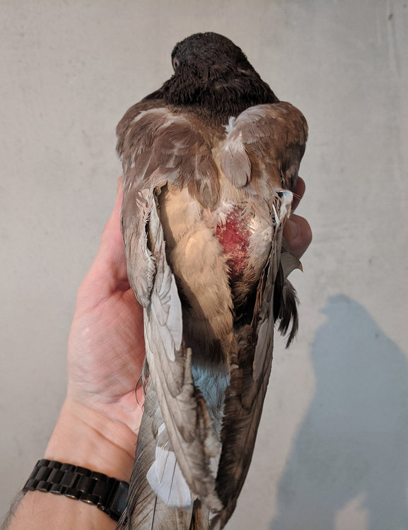 С виду кости целы, летает, на ногах уверенно стоит, хвост почти полностью вырвало, пару перьев осталось. Садин немного, кожу скобленуло.