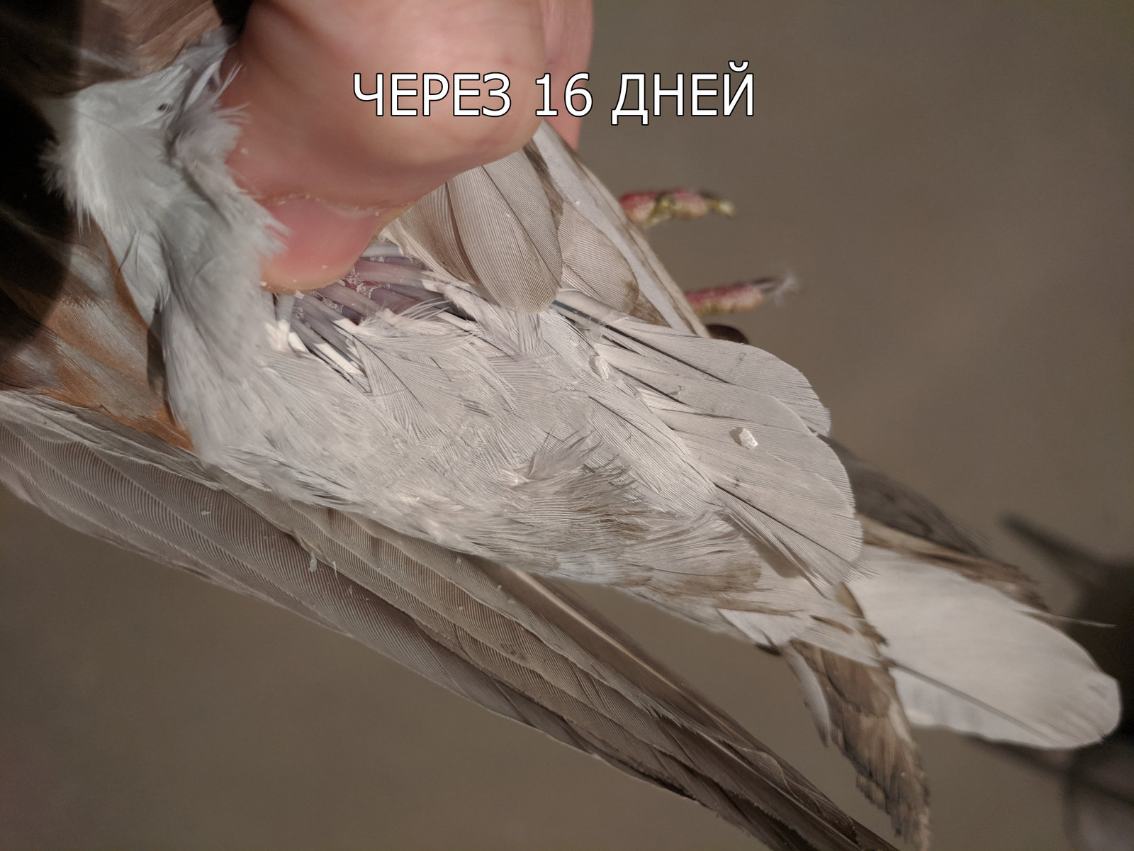 Перья начали расти и относительно быстро. Это хорошо. В добавок он пострадал ещё в период линьки. Как его потом его только выпускать с +20 на -20, видимо сначала перенесу на застеклённый балкон для адаптации. А выпускать буду при тёплой погоде в -10 — -15 (+/-)