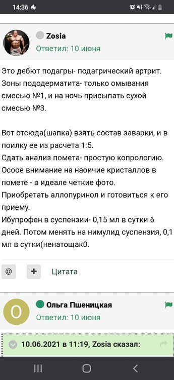 Ольга Пшеницкая Опубликовано 20 июня, 2021 Автор #8 Опубликовано 20 июня, 2021 Мы лечимся по Зосиному назначению 10 день( приложу скрин рецепта) ,но к сожалению не вижу ни каких перемен в лучшую сторону, лапки отёкшие, мозоли ни куда не деваются. Жерди в клетке обмотала нитью. Крылышки лечим тоже, хлоргекседин, гидрокартизоновая мазь,мирамистин в клюв по Зосиному назначению и для поддержки печени в корм расторопшу и в клюв гепатовет. Зося назначила ещё такой препарат аллопуринол,сказала готовиться к его приёму,но она не указала дозировку и применение. Я купила аллопуринол в таблетках, скажите когда его пртнимать и в какой дозировке? Я задала вопрос Зосе тоже,жду ответа! А вот последние фото лапок. Спасибо за помощь!