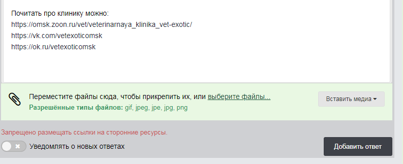 olegru100 Опубликовано 22 июня, 2021 #11 Опубликовано 22 июня, 2021 (изменено) @Набежда Я нашел Полину Юрьевну Смыслову. Работает: Ветклиника "Vet-Exotic" г. Омск ул Масленникова 82 ? +7 (961) 884-96-66WhatsApp, Viber, звонки) ?63 90 02 (только звонки) Работаем ежедневно с 11:00 до 21:00 Звонил по номеру 8 961 884-96-66 (номер еще с 2017 года) ответил Павел Владимирович - объяснил ситуацию с вороненком. Полина Юрьевна, в связи с болезнью, ведет прием 2 дня в неделю - среда, суббота. Павел Владимирович предложил мне в среду записаться на четверг к Екатерине Александровне Никифоровой - ученица Полины Юрьевны, для осмотра птицы и выписать направление на рентген, объяснив, что они в курсе где делают качественный рентген и сразу напишут в каких плоскостях делать рентген. Стоимость приема - 200 (двести) рублей - по цене пояснил, что мол это подобранная птица и не домашняя. Надо воспользоваться случаем! Если хотите я с Вами проеду, но завтра надо записаться на прием по этому телефону 8 961 884-96-66 и сказать, что состояние вороненка ухудшается, может завтра и примут и мне позвонить, я на машине. За рентген я готов заплатить. Жду от Вас звонка. Или скиньте сегодня на мой номер тел. ваш номер - я приехал с дачи домой написать это сообщение и сейчас опять на дачу (с дачи интернет только по смартфону жены - пробовал это сообщение со смартфона написать, но даже и не смог войти в свой аккаунт) Почитать про клинику можно: 20.06.2021 в 22:00, Набежда сказал: К врачу мы не попали, не потяну стоимость обследования. Потом мне скажите где это Вы были. Я с ними всю Страну познакомлю. Изменено 22 июня, 2021 пользователем olegru100 Добавление 3