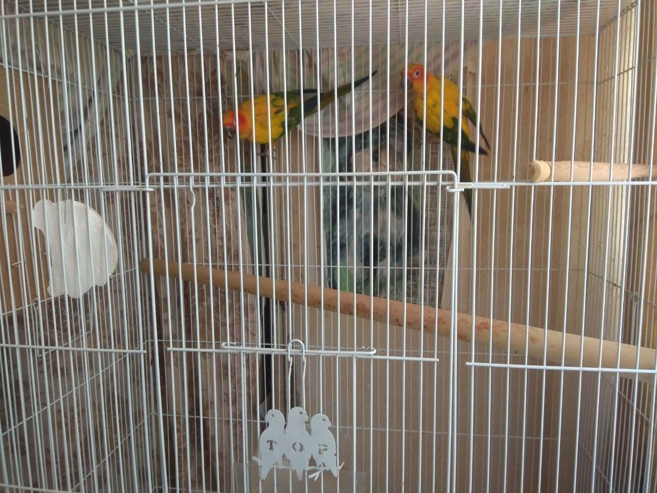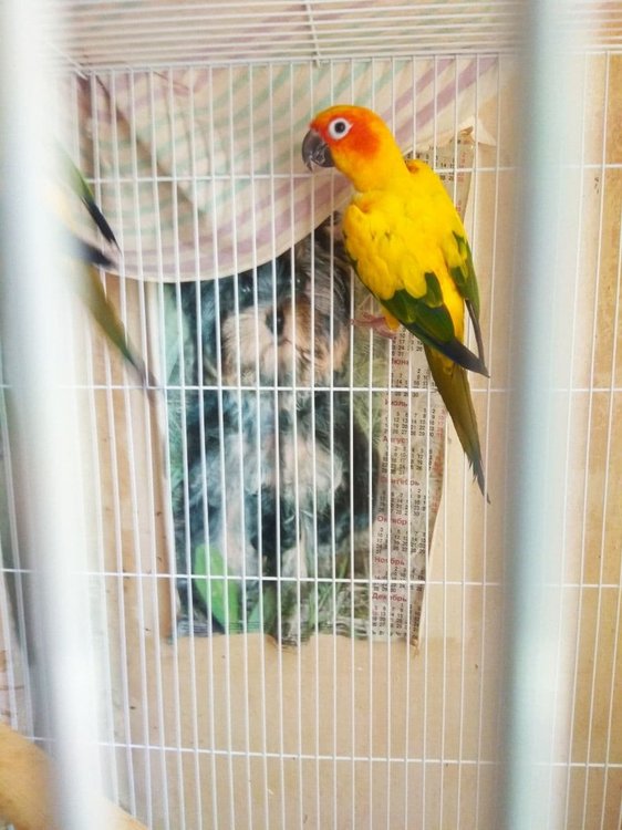 Всем привет! Посчастливилось мне приобрести пару солнечных Аратинг. У меня уже есть три ожерелика, один из низ проблемный, но в общем не суть. Так вот, с приобретением ожереликов, я стала атаковать зоомагазин, просить привезти разные приблуды) Что то вроде игрушек, нормального и некрашеного корма, мелков, и всей этой чепухи. Стала уже "своим" гостем. В связи с карантином, зоомагазин закрывается и им срочно нужно было сплавить всех животинок. Меня долго уговаривали забрать оптом волнистиков, но я все таки каким то образом избежала, ибо мне своего добра хватает. Этих Аратинг купили и увезли в другой город за 400км. В итоге, из за их крика от них отказались и привезли обратно в магазин.  Магазин соответственно закрыт, птиц девать некуда. Хозяйка нашла меня и прям упросила их забрать иначе они погибнут в такой жаре на улице или в непроветриваемом вольере на складе. Ну я взяла это чудо. А вот что с ними делать не знаю. В приданное к птицам шел вольер 1м в высоту, 70см длина 50см ширина и дуплянка. Я наставила жердочек деревянных разного диаметра. И так к вопросам!