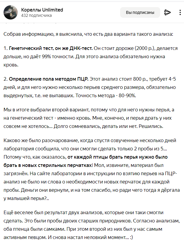 Vivern Опубликовано 28 июля, 2021 #2 Опубликовано 28 июля, 2021 (изменено) Добрый день! 17 часов назад, DaryaS сказал: Думала насчет анализа для определения пола , но не готова сама вырывать перья - насколько такие действия пугают птицу и причиняют боль? Если вашей корелле 4 месяца, то она скоро поведением проявит свой пол. Если это самец, он будет петь песни, делать крылышки "сердечком" и стучать клювом как дятел. Самки песен не поют, а других нюансов их поведения я не знаю, т.к. у меня самец. Вот описан опыт определения пола по перу: ... В общем, я не вижу смысла в анализе. Тем более, если корелла ещё не адаптировалась на новом месте и не привыкла к вам, то лишний стресс только может затянуть процесс адаптации. Ещё у кореллки очень тонкие жёрдочки. Посмотрите, пожалуйста, в статье про клетки там с картинками показан нужный диаметр жёрдочек: https://www.mybirds.ru/base/kletka.php Ну и вот тут ответы на другие ваши вопросы: https://www.mybirds.ru/forums/topic/39494-nachinayuschemu-korellovodu/ Изменено 28 июля, 2021 пользователем Vivern