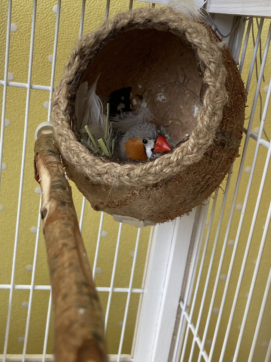 Для гнездования я установила в клетке гнездо закрытого типа (делала его сама из кокоса), гнездо к слову сразу приглянулось птичкам, со 2-го для после установки они начали в нём ночевать. Потом я накидала сухой травы на дно клетки. Самец начал строить гнездо. И..о боже..начал общипывать самку для получения пера.? Дабы избежать облысения самки я накидала перьев из подушки на дно клетки. Самец перестал выщипывать самку. Достроил гнездо и через 2-3 дня появилось первое яйцо. Самка каждый день откладывала по яйцу, сейчас их пять.6B90147E-CAC9-430F-B22C-088997995B5A.thumb.jpeg.57555ef1c3f3022236ee61bacc3061a3.jpeg