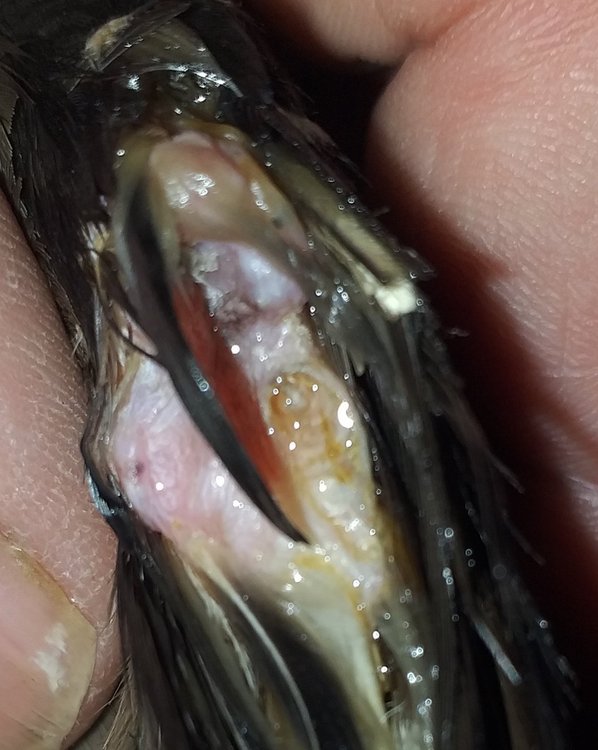 Валентин, Эжва Опубликовано 12 июня, 2022 Автор #53 Опубликовано 12 июня, 2022 Сегодня снова неприятности с Гошей, утром зашёл - на полу клочья перьев, с груди выдрал, капли крови на полу. Также большое перо лежит, потом нашёл молодое, кровяное перо. На боку, на левом крыле видна кровь. Почему он перья с груди выдрал? Может из за боли от сломанного молодого пера, но раньше ломались такие перья и ничего не выдирал, или ещё что-то болит? Гошу словил. Сначала капнул на кожу шеи у затылка 0.05мл фронтлайн, инсулиновым шприцем. Покупал 2 пшика в ветеринарной клинике. Осмотрел кожу на груди, откуда перья выдраны. Увидел выступающую часть из груди, тёмнокраснобурого цвета, подумал-опухоль, потом пришла мысль, что это пищевод или трахея, это так и должно быть? На левом, травмированном крыле и боку кровь. Кожа красно-бурого цвета, она такого цвета должна быть? Всё смачивал хдоргексидином и вытирал марлевым тампоном. На крыле есть какая то жила кровяная, наверно вышла из обломанного молодого пера, эта жила входит в ооставшуюся часть трубки пера. Если задеть эту жилу Гоша дёргается, значит очень болезненно. Не знаю, что делать с этой жилой, от того что она снаружи может ли инфицироваться всё крыло, может антибиотик надо давать? Я обработал, промыл, хлоргекидином. Ту часть пера откуда выходит жила точечно смочил перекисью и присыпал стрептоцидом. И ещё вопрос. Залысины у основания клюва и вокруг глаз - это о чём говорит? Нужно ли что-то делать или само прйдет?