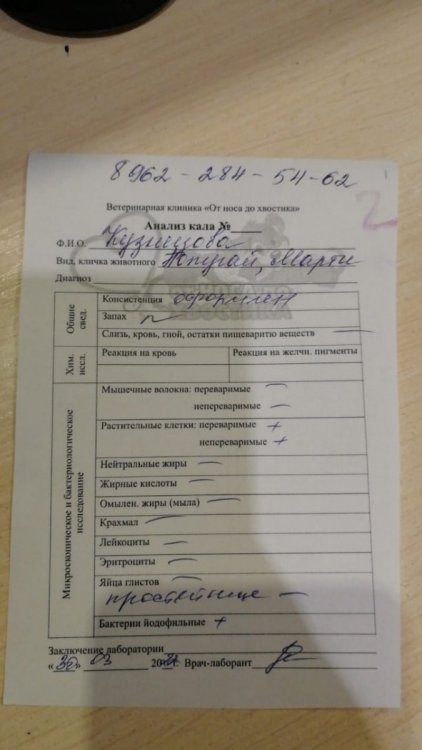 Apriori Опубликовано 30 марта, 2022 #1 Опубликовано 30 марта, 2022 Здравствуйте. Заболела наша птица. Помогите! Ниже прилагаю фото помета и анализ - это максимум, что могут сделать в моем городе. Бакпосев не делают.... Попугай корелла Марти 3. её возраст и пол; жён, 9 лет 4. подробно распишите рацион (с указанием названий кормов и витаминных препаратов); РИО, гречка, салат, морковь, огурчик 5. опишите условия содержания птицы (температуру и влажность воздуха в комнате) и длину светового дня; 12 часов, суховато дома, температура 25 градусов. Птица на свободном выгуле - со мной, работаю дома 6. опишите настораживающие вас симптомы; 3 неделю жидкий помет, птица ест и летает как обычно, с сегодняшнего дня аппетит хуже. Похудела в но настроение хорошее 7. напишите, как давно птица болеет; 2,5 недели 8. если птицу уже лечили то, пишите: суммамед детский, суспензия по 0,01 мл 2 раза в день - неделю. Ветом 1.1 неделю в корм, расторопша, энтерол, отвар ромашки 8.1. какие исследования, где и как давно проводились; 5 дней назад сдали помет, нашли лейкоциты 8-16. Больше ничего вообще не расписано. Сегодня получила анализ - везде минусы, кроме йодофильной флоры и перевариваемые и не перевариваемые - здесь плюсы 8.1.1. каковы их результаты; 8.2. какие препараты, в каких количествах и как долго применялись; 8.3. каковы результаты лечения. Помет по-прежнему жидкий, ночью более густой Ещё три дня давали тетрациклин 1/3 таблетки на 5 мл воды по 3 капли три раза в день - ветеринар сказала, после того как увидела лецкоциты. Сегодня не стала давать ей прочитала, что от него может быть диарея