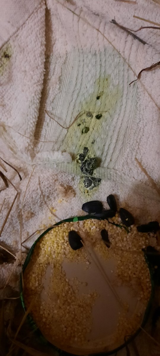 Дали ещё 1/2 угольной воды... Голубь так то упитанный, нормальный, но ничего так и не поел, сидел в том же положении, что уснул, сейчас также сидит ничего не ест, но угольную водичку пил нормально. Вот его утренний кал