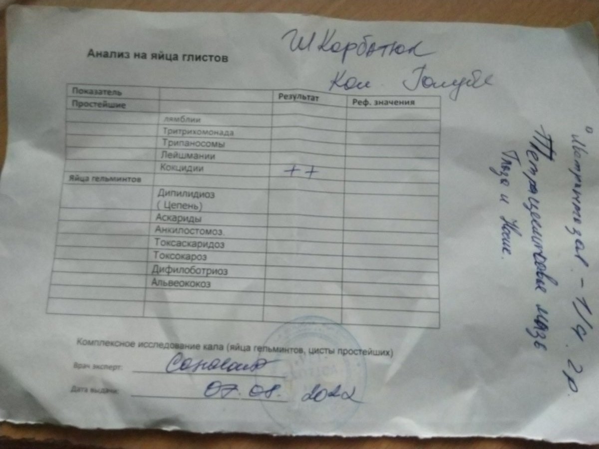 Valery.V.Sh Опубликовано 10 августа, 2022 Автор #30 Опубликовано 10 августа, 2022 (изменено) 10 минут назад, ElizavetaO сказал: Можно попросить фотографию с результатов анализа? =кокцидиоз. Он пытается покакать но не может Изменено 10 августа, 2022 пользователем Valery.V.Sh