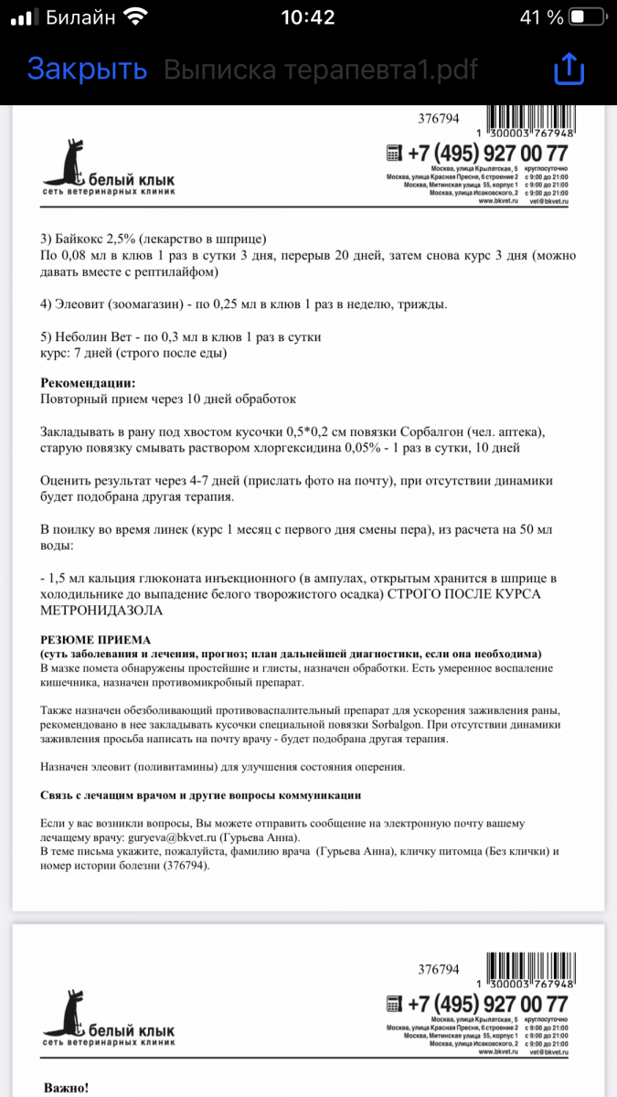 Кристина Тиль Опубликовано 1 ноября, 2022 Автор #465 Опубликовано 1 ноября, 2022 @Zosia у неё глисты простейшие и какцидии. От простейших есть лекарство от какцидий назначала рептилайф в шприце я его найти не могу . До этого сдавала помет там E.Коли 10/8 , стафилокок 10/6. Рана зажила . Обрабатывала смесью номер 1 . Но не факт что она не откроется заново . Она открылась в третий раз , последний раз из за Линки возле РАНы было много перьев новых . Какое есть средство кроме рептилайфа? @Zosia ходили в белый клык . Сказали глистогоннить и дать метронидозол 7 дней . Кальций и лампу . Серу куплю Сегодня рана закрылась )) чтоб не трескалась надо левомиколью мазать ? Диокседин уже не лить ? 1