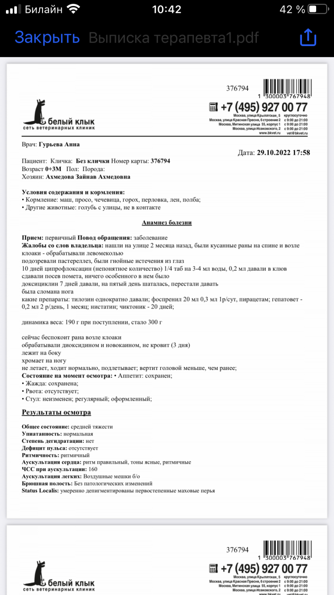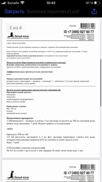 Кристина Тиль Опубликовано 12 ноября, 2022 Автор #493 Опубликовано 12 ноября, 2022 @маленький принц не шили прошлый раз . Оставили так заживать . Врач придёт с отпуска через 2 недели если не заживет и опять порвётся то поедим шить . Хочу дать птице ронидозол место метронидозола. Его можно давать один раз в деть а это очень удобно. Метронидозол не убивает до конца трих а рони убивает . @Cabrera я купила инфузии 7 штук . Открытый чтоб дать втрой раз в деть убрать в холодильник? Или лучше мне дать ронидозол. Посчитайте мне дозировку на вес птицы 290 грамм пожалуйста. И можно ли его хронить в холодильнике? Он ведь лучше метронидозола , может его дать? Олин раз в деть давать куда лучше . Как раз и рептилайф привезли . Пахнет помет кислым . Как будут деньги отнесу помет на анализ . На чувствительность к 24 антибиотикам . Думаю там Е Коли живет до сих пор . 2
