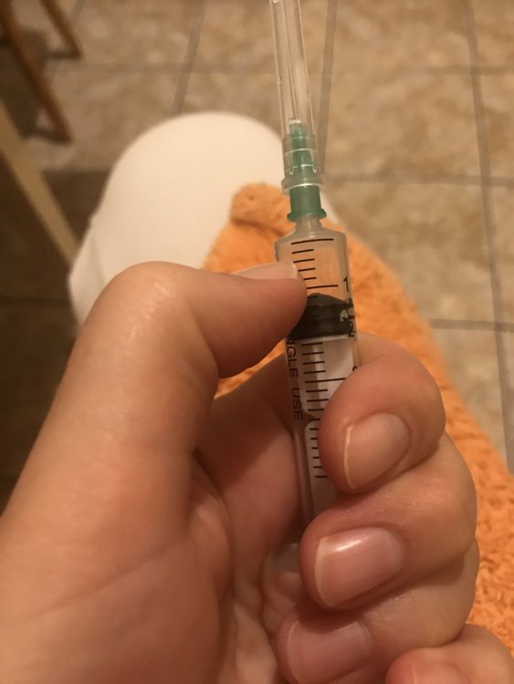 Кристина Тиль Опубликовано 3 сентября, 2022 Автор #77 Опубликовано 3 сентября, 2022 Набрала из шприца 5 мл два маленьких отделения и добавила воды до 2. Слава богу не набрала 2,5 отделения . Шяс набрала из этих двух маленьких обратно в инсулин получилось 40 . Меньше половины инсулина . 05 это ведь не 00.5?! Вроде правильно сделала , дозировка как на метронидозол только там 36 тут 40 . И дала 14 на инсулине . Дала на всякий случай инторосгель , воду и гепатовед. Что ему не очень сегодня хорошо и до толозина тоже . Вечером начал шею вытягивать глаза прикрыты , беру не руки открывает . Вроде щипает меня на это у него силы есть . Но так плох он . Если я все правильно дала сегодня и он доживет до утра , думаю ему сделать укол завтра толозина , терять уже нечего . Вот на фото сколько набрала и довела до 2 кубов .