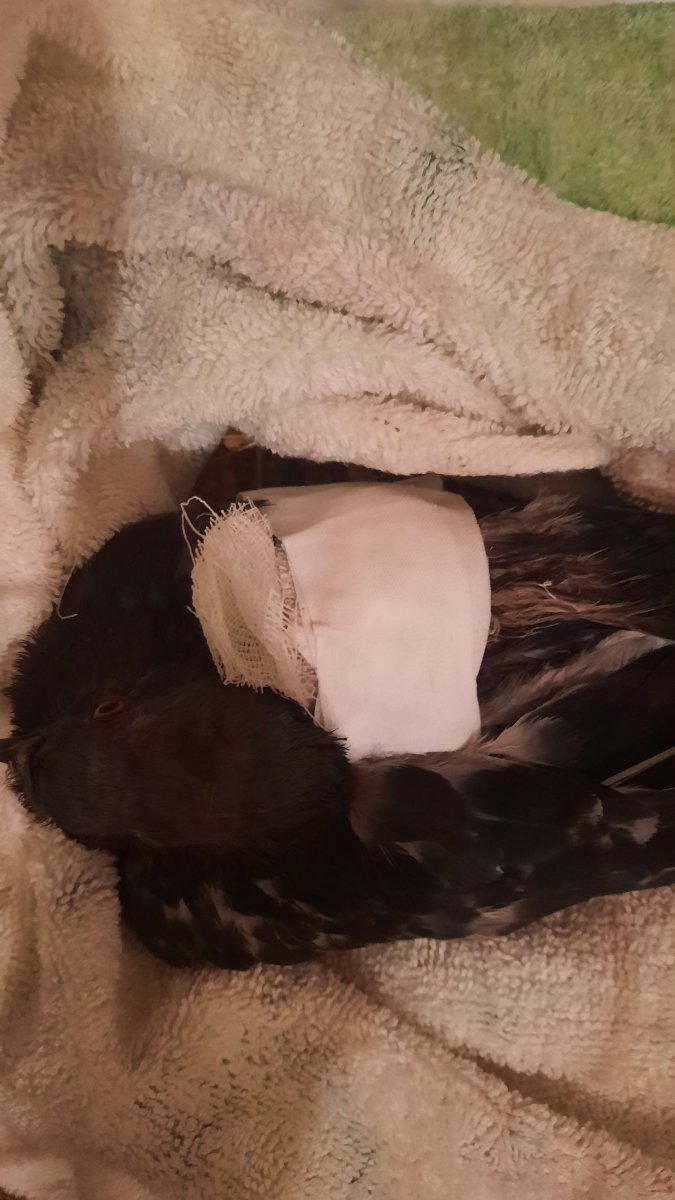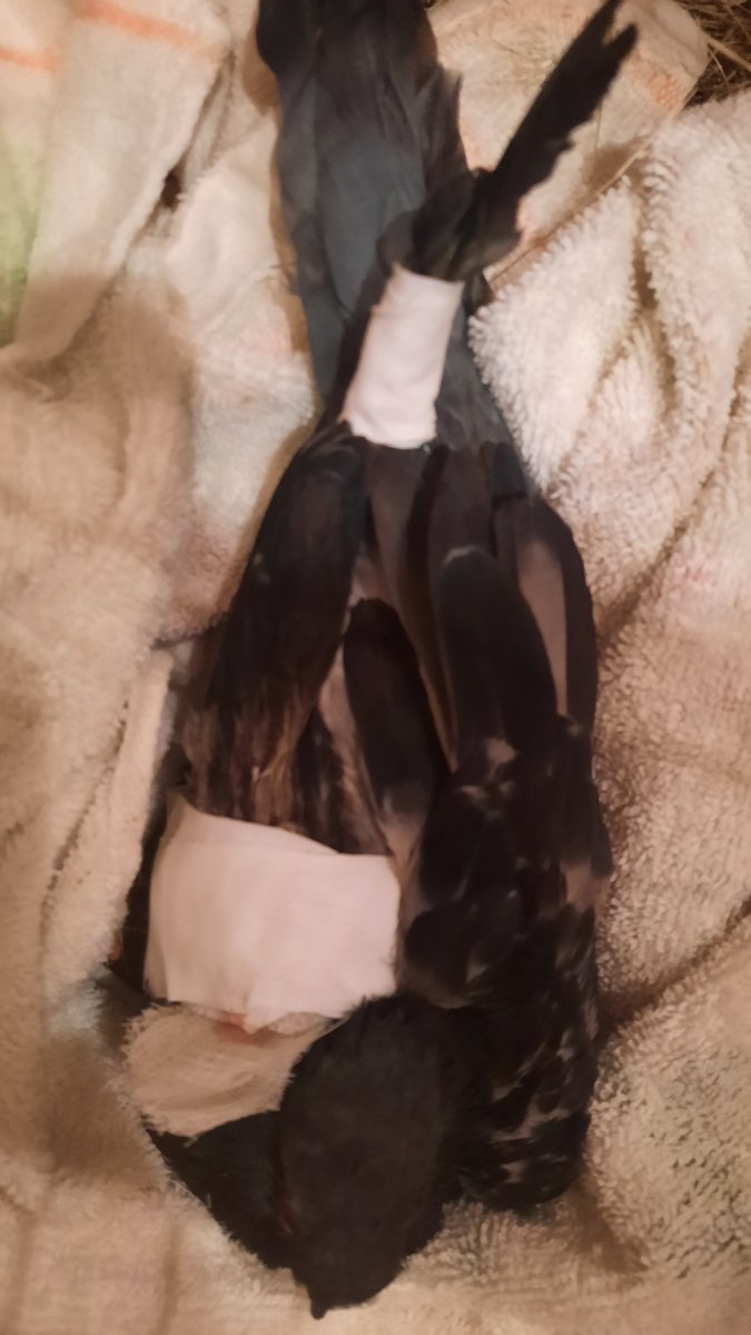 @Тузя @K_vit зафиксировала, но думаю, что неправильно, с хвостовой частью полностью обездвижен,  если без хвоста, то заваливается и крыло травмирует, так как из-за необходимости обрабатывать рану фиксация с одной стороны, а не крестом