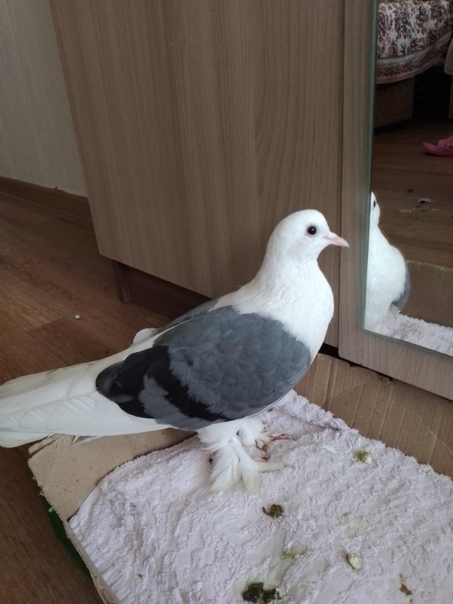 Ирина 14 Опубликовано 16 сентября, 2022 #1 Опубликовано 16 сентября, 2022 (изменено) Добрый вечер! Помогите , пожалуйста, определить породу и примерный возраст птицы. Птица подобрана с улицы в ослабленном, истощенном состоянии, грязный, "блохастый". Сейчас птица стала набирать вес, стала высоко летать, активно бегает, интересуется кормом. От пухоедов обрабатываем до сих пор щадящими препаратами, их стало намного меньше. Мучает лишь вопрос - что за порода. На вид птица необычная, у нас таких в городе не видела никогда, только на картинках. Птица ходит очень грациозно, свесив крылья. Глаза темно-вишневые. Перья очень жесткие, на голове короткие. Пуха очень мало (по сравнению с сизариком, который живет у нас дома). На хвосте 20 больших перьев! В целом птица в полтора раза крупней сизарика, очень длинный хвост и крылья. Человека почти не боится, даётся в руки, позволяет проводить разные манипуляции с собой, даже щиплиться. Просит вкусняшки. У меня подозрения, что птица молодая, до года, но меньше 3 месяцев, поскольку грива отсвечивает зеленым не равномерно, а как бы пятнами (будто не все перья поменялись). Сейчас у нее началась линька. Хотелось бы узнать мнение специалистов-знатоков. Заранее благодарю! Моя вертячная голубка, которой 1 год и 3 месяца, запала на этого красавца, гукает, пытается к нему подсесть. А он ее гоняет. Голубка даже нестись начала, пыталась яйца высиживать, но через несколько дней расклевывала. Думаю, что белый - это пацан, еще не половозрелый. Сейчас вроде гонять ее стал меньше. Но с полом и возрастом могу ошибаться. Изменено 16 сентября, 2022 пользователем Ирина 14 1