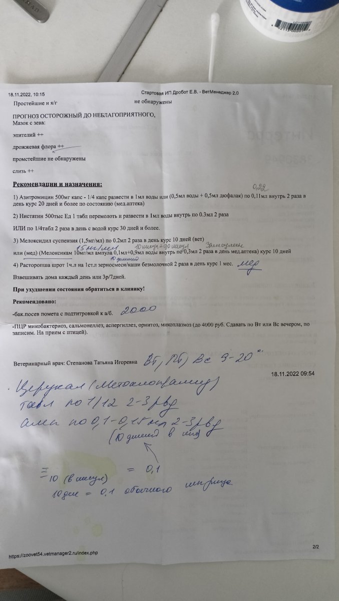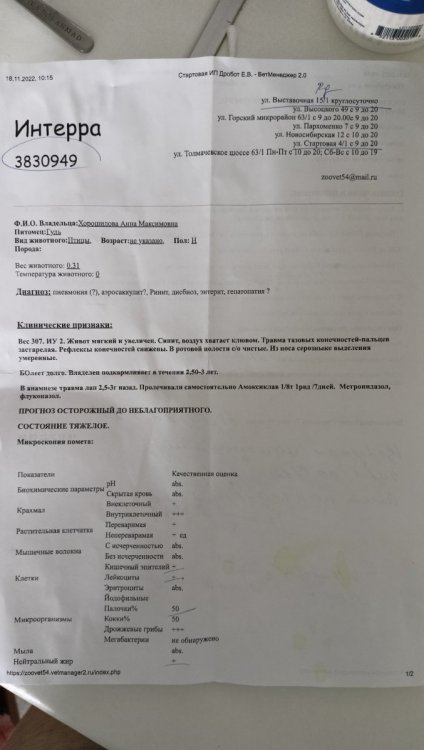 sunnyfunny Опубликовано 19 ноября, 2022 Автор #4 Опубликовано 19 ноября, 2022 Я была уверена, что я в верном разделе сделала тему, именно в лечении? я и удивилась, думаю как так - в тот раз мне помогли очень оперативно. Ну я не растерялась, вижу что никто не отвечает и лечение особо не помогает - я выловила своего голубка и отвезла к орнитологу. Были вчера. Лист осмотра прилагаю. Хотели сделать вчера рентген - орнитолог побоялась, говорит, нужно сначала его стабилизировать. Что там укладывают на спину и птице это тяжело, особенно с одышкой. И что это может быть последние его вздох? + он был не голодный. Рисковать не стали. Прилагаю лист назначений + фото носика + фото свежей порции помета. Из того, что даю сейчас: 1. Азитромицин по схеме 2. Нистатин - по схеме 3. Мелоксикам по схеме Когда приехали (дорога была длинной) - не стал есть. Даже с рук (с рук ел у меня всегда раньше). Я списала это все на стресс и то, что мы были в дороге 4 с лишним часа + там. Вечером, перед сном - ситуация та же(((( я не стала испытывать судьбу - накормила его разваренной кашей (орнитолог сказал, тк болит живот - он хвостик опускает - это значит болевой синдром). Дала в общей сложности - 10 мл (смесь пшена, перловки, геркулеса, гречки, гороха - перемолотые в кофемолке и разваренные), туда же помешала расторопши шрот, тк с печенью тоже не все гладко, по словам врача. Утром ситуация аналогичная(((( Также влила силой - 10 мл смеси. Я купила катетер типа бабочки - но он выплевывает его капец(((((((((( она еще тонкая, вся как-то никак туда не могу затолкать.... ((( тогда я взяла трубочку от системы для капельницы, оплавила конец и заливаю через него (она более жесткая, я опускаю и за 3-4 сек ввожу ему порцию, мучения меньше. Вопрос - сколько нужно давать за раз и как долго кормить так? Пока сам не начнет? Всегда боюсь куда -то не туда ткнуть, а учитывая, что он дышит ртом - это капец как страшно поэтому я стараюсь сделать максимально все быстро. Помогите, переживаю, что делать? Сейчас гуль у меня дома - сидит в клетке. Иногда хохлится и опускает хвостик(((( Вопросы следующие: 1. Как долго так кормить и нужно ли силой кормить? 2. Сколько мл давать за раз и как часто кормить? 3. Врач сказала странно, что нет простейших и гельминтов. Для уличника это странно. Честно говоря, я не помню, но последние 2 года я точно его не глистогонила. Хотя взяли мы наисвежайшую порцию помета. 4. Ацки боюсь кормить его, тк носом он не дышит. Соплей визуально не вижу, но дышит ртом. врач осмотрела внури - все чисто. Чем ему помочь еще???((((( Врач сказала, что к тому же голубок в солидном возрасте для дичка и условия улицы конечно дают о себе знать, но совсем как-то не хочется верить, что его дни сочтены. Я кормила его 3 года. Как перенести тему в нужны раздел? Помогите, пожалуйста. Или заново создавать?