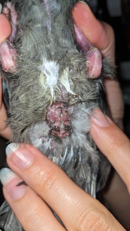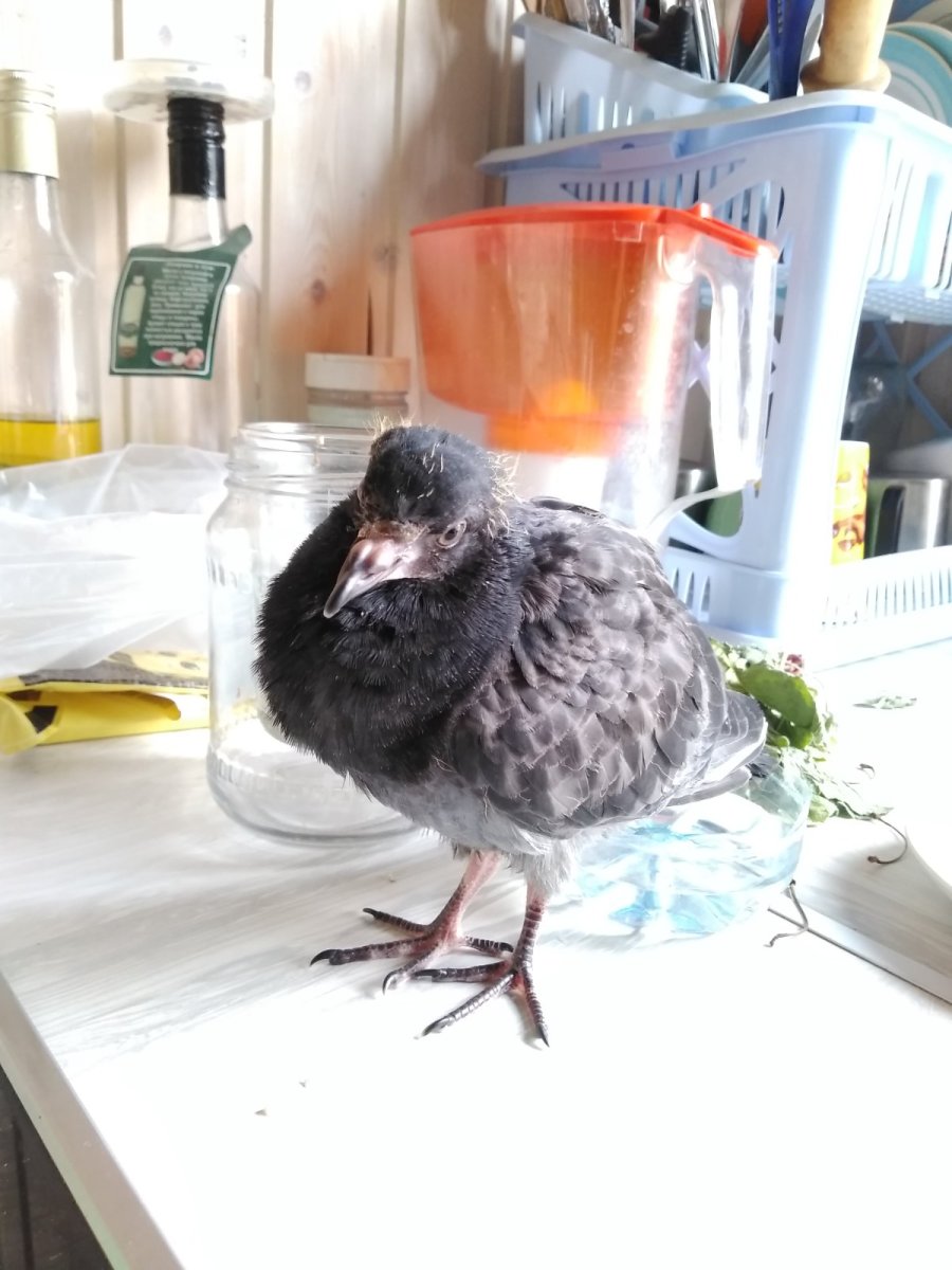 Анхелианн Опубликовано 18 июня, 2023 Автор #57 Опубликовано 18 июня, 2023 Всем добрый день! У меня очередной питомец на спасение) Вчера забрала малыша. Был в подвале многоэтажки. По всей видимости упал туда по вентиляции, в этом здании делают крышу, возможно напугали и он выпал. Видимых повреждений нет, на лапках стоит хорошо, цепляется тоже нормально. Он маленький совсем, ещё жёлтый пушок есть, и шейка внизу и тело под крылышками голое. Наростов ни в горле, ни рядом с клювом нет. Киль худой. Ест сам и пьет сам. Распариваю дробленую пшеницу, и он её клюёт. Помёт коричневый, но совсем не оформленный. Птенец много спит и хохлится, а ещё много пьет и в помёте очень много воды. Спит и на одной лапке и на пузике. Добавить пробиотик в кормление и всё пока? Наблюдать как будет себя вести дальше? А ещё у него лапки черного окраса. Никогда такого не видела, обычно все розовые))) И он такой темный, что похож скорее на галченка 1