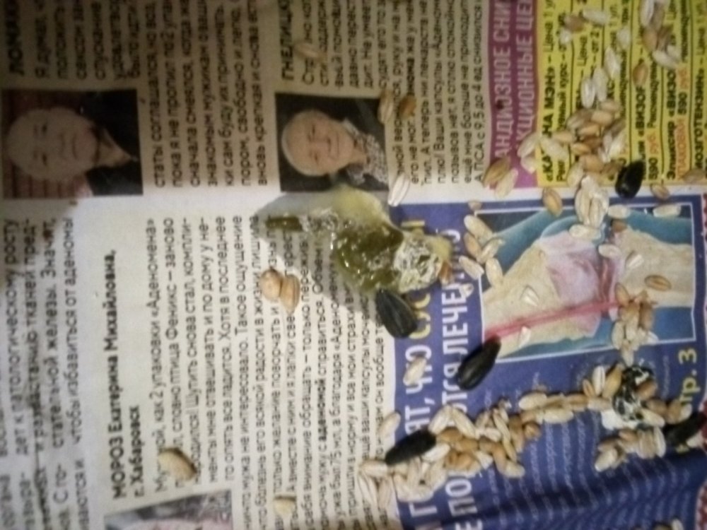 Budgiek Опубликовано 25 января, 2023 #82 Опубликовано 25 января, 2023 Насчет темного помета раньше... У вас там в рассыпаны семечки неочищенные, вот черная труха в помете появляется из-за перетирания в мускульном желудке этой шелухи, она не переваривается. Не нужно в шелухе давать вообще ничего, ну чечевицу может только, да и то ни к чему. Я к тому, что крови-то там наверное и не было. По последним фото цвет помета ну более-менее нормальный. До крапивы тоже был такой или только после стал? Несформирован, но у вертячников и просто понос может быть. Уберите семечки подсолнуха из еды совсем. Можете для поднятия настроения по 1-2шт в теч. дня пару тройку раз дать очищенных. Если овес давать то, для питания, вообще они не нужны. Не пойму по фото что там - рис, перловка и семечки, пшеница есть там? Если есть и пшеница и перловка, то рис лишний. Овес-то удалось найти? Купите Геркулес "Деревенский", это прямо то, что надо, цельный и отшелушенный. Если такого нет, то "Монастырский" он малоплющенный. Гороха колотого или чечевицы прямо чуть-чуть 1/10 можно добавить. 1