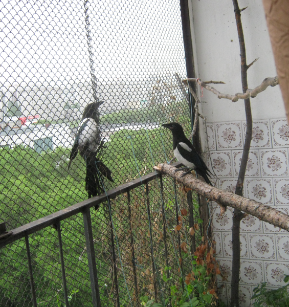 Сорока  живет в моей комнате в большой вольере на колесиках.  В квартире на выгул не выпускаю. По понятным причинам - гадит где попало и ворует все подряд, прячет. Гуляет на зарешеченом балконе  Когда хорошая погода. До темна.   Птичке второй годик.  Всегда  балкон был в зелени, сажала разные цветы и вьюнки пускала по решетке.  В этом году сорока выкопала все цветы , копается в земле, раскидывает по полу,....   Чумазая , как шахтер.  Искупается в тазике , обсохнет и опять на раскопки.  Второй раз в эту воду не лезет.  Надо заменить.